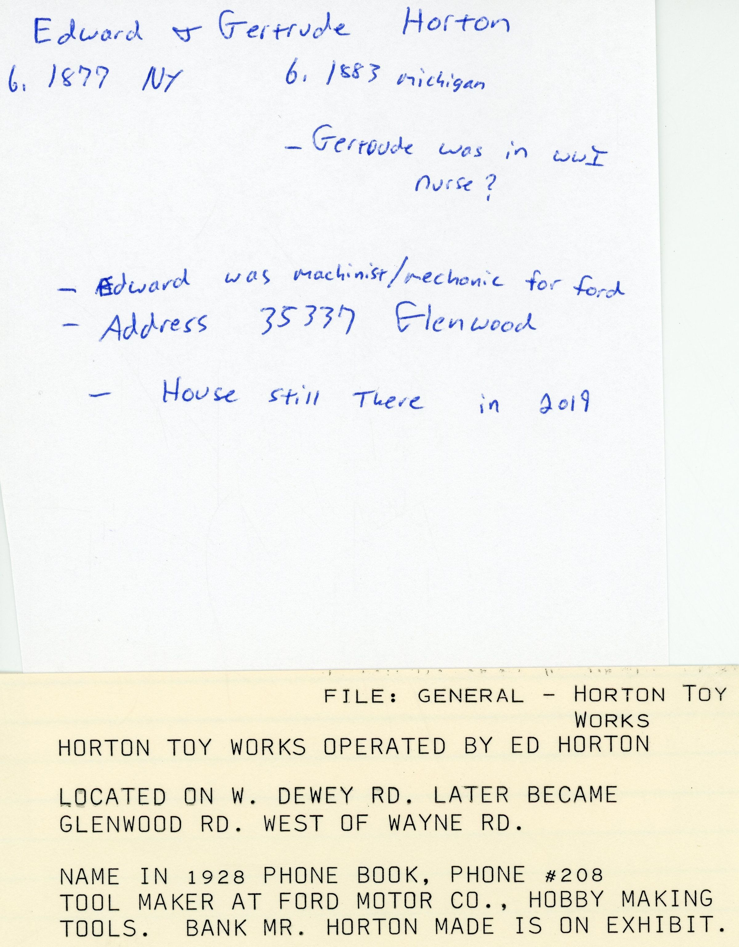 Horton Toy Works. 35337 Glenwood. Edward and Gertrude Horton. Ed Horton made toys, banks and elaborate steam engines out of his home in the 1920s and 30s. Home still exists as of 2025.Cataloged By