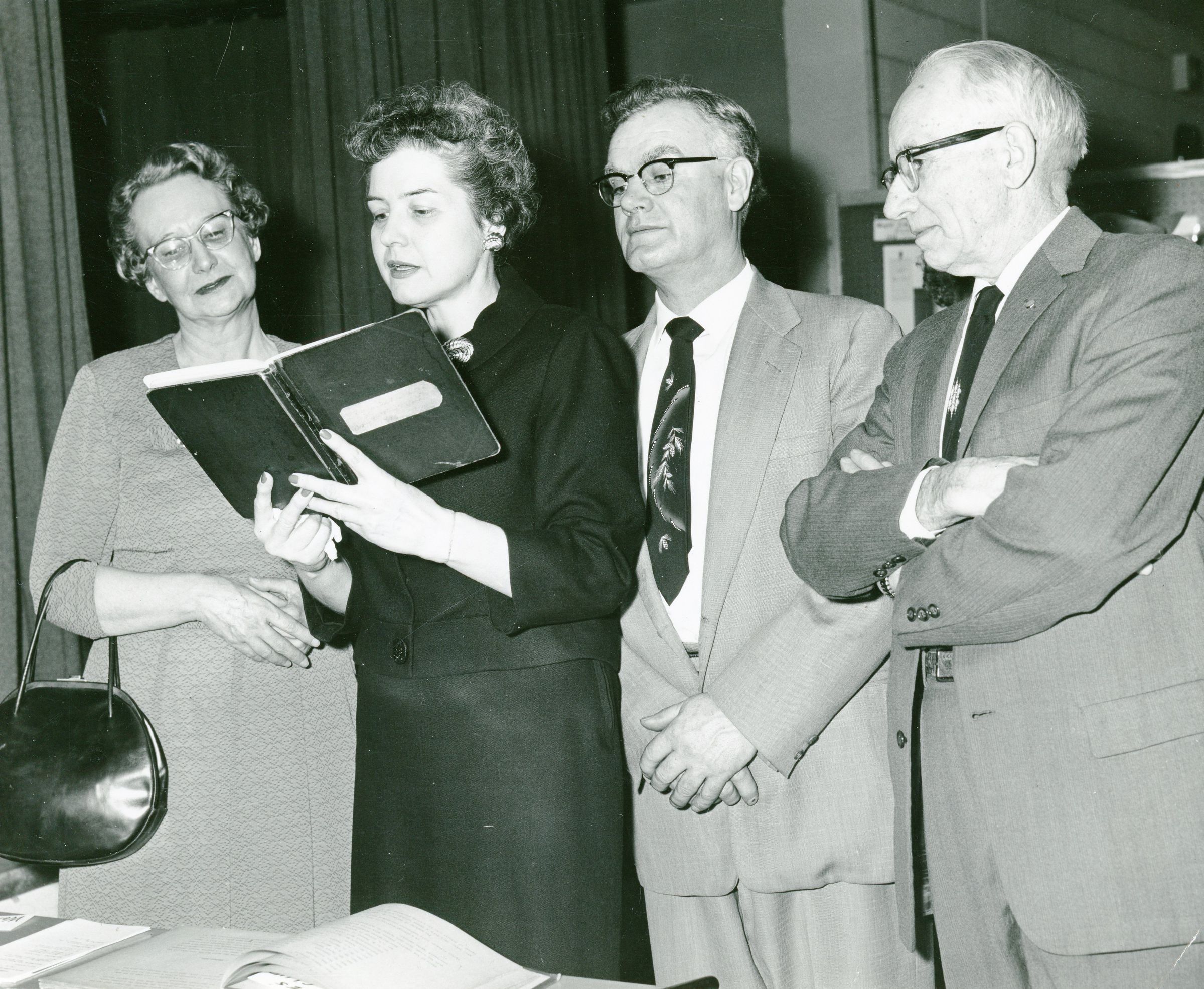 Meeting at Congregational Church on Jan. 12, 1961. The topic was "Clubs and Organizations of Wayne" . The speaker was Mildred Hanchett of the Wayne Historical Society. From Left to Right; Mrs. Hess, Mildred Hanchett, George Januson and John Wilson.Cataloged By