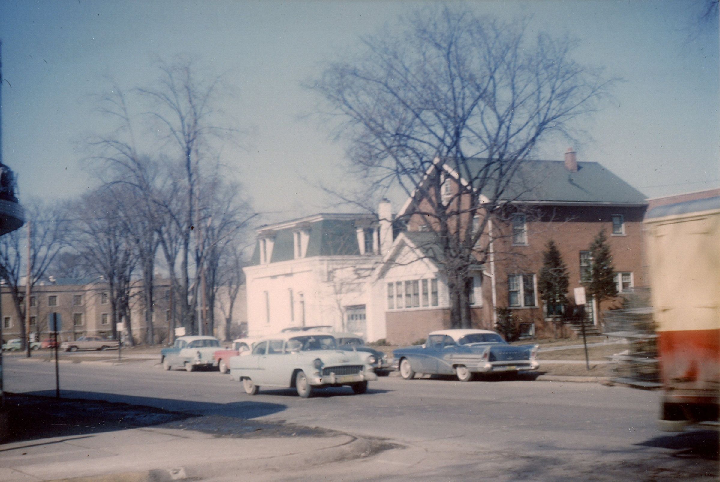 Village hall and Congregational Church Parsonage (35122 Main). Looking NW between Monroe and Washington (Wayne Road) Methodist Church House in background left. 1956.