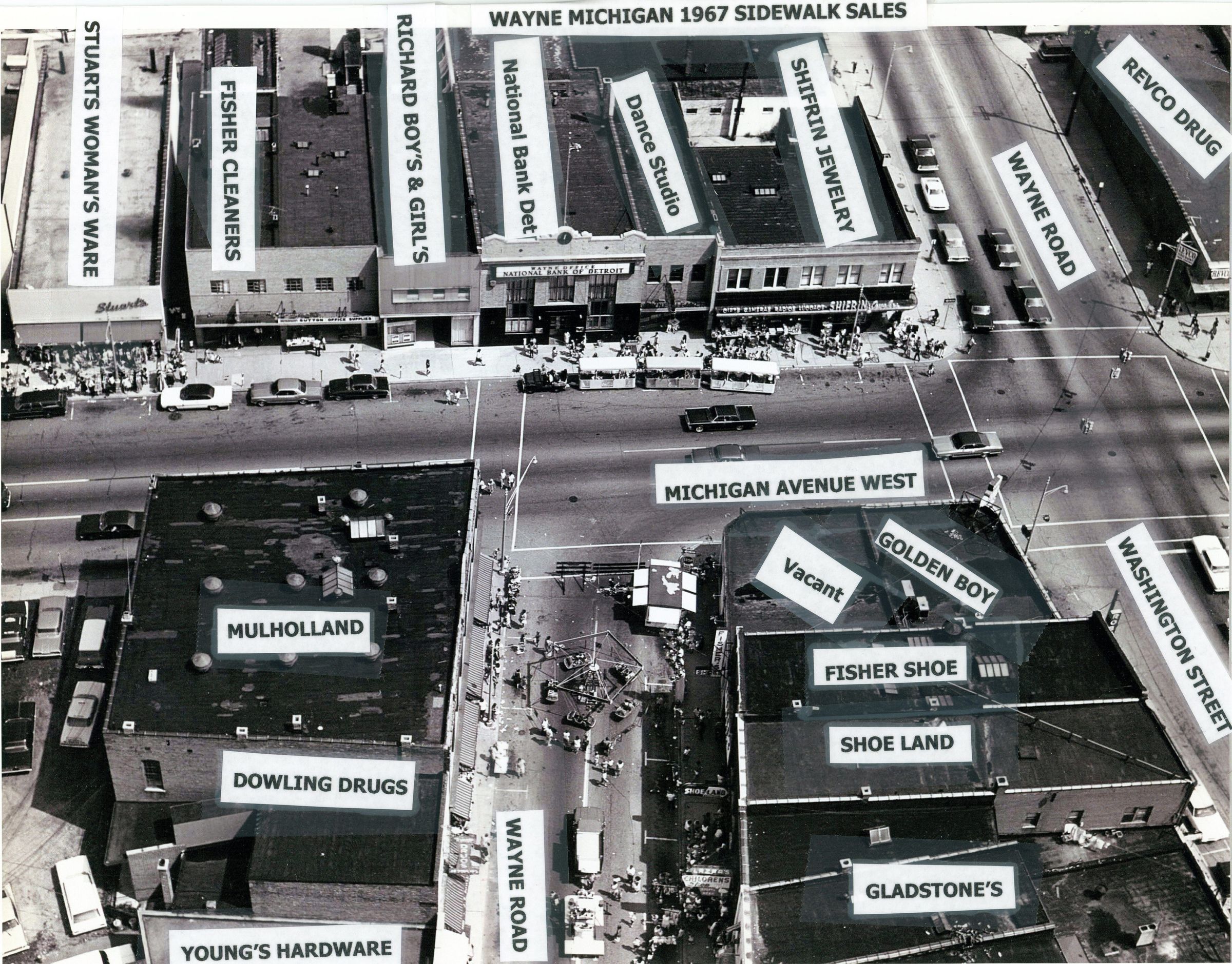 Sidewalk Sales Monroe Street and Michigan, looking North. Mulhollands, Stuarts, Fisher Cleaners, National Bank of Detroit, Shifrin Jewlery, Golden Boy, Fisher Shoes, LazarsCataloged By
