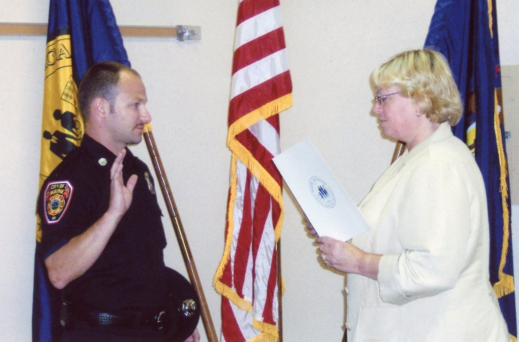 City Clerk Carney swearing in firefighter J. Schneider in 2008.