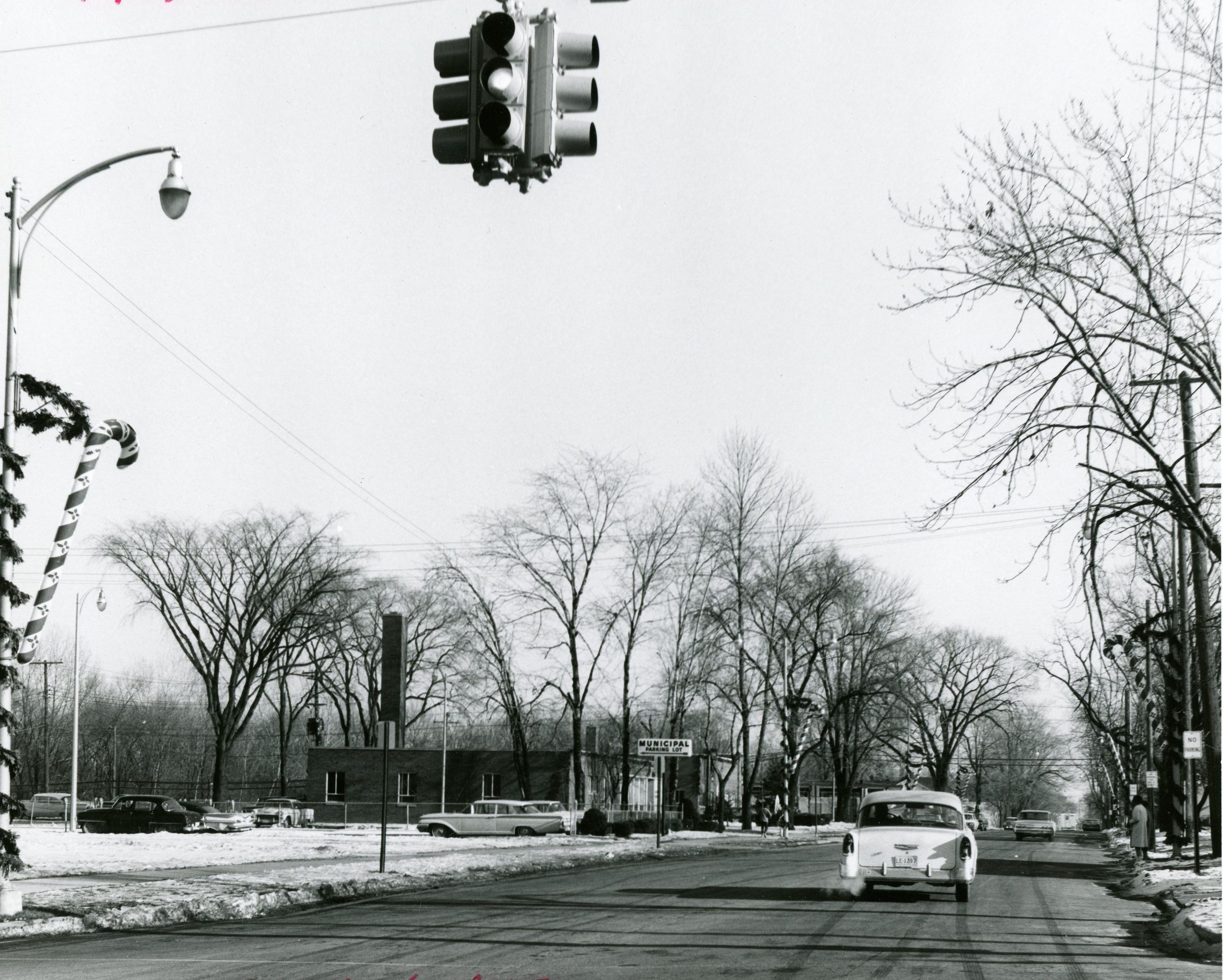 Sims looking East from Wayne road. Municipal parking lot and police station on left and center of picture. Christmas decorations and snow on the ground.