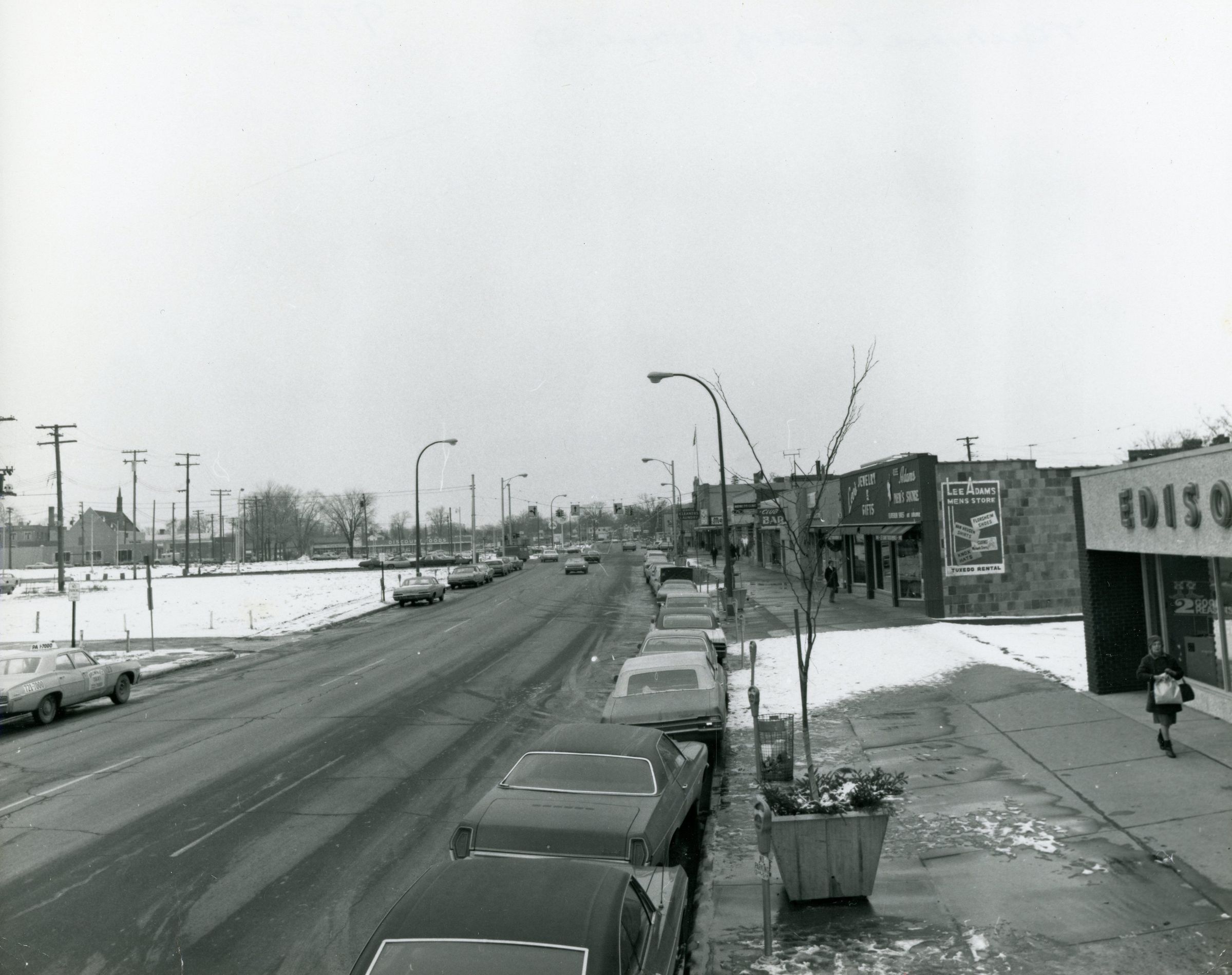 Michigan Avenue looking West from 34852 Michigan (Edison Office). February 1972. Buildings on South side have been cleared for Urban Renewal. Lee Adams Menswear visible, Leos gifts would later be built in the gap.Cataloged By