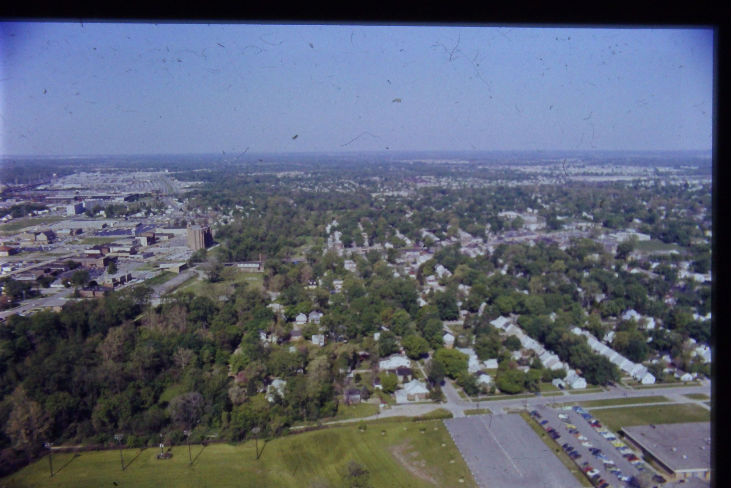 Aerial over 4th street looking West. Wayne memorial is in lower right. 1970s, post urban renewal