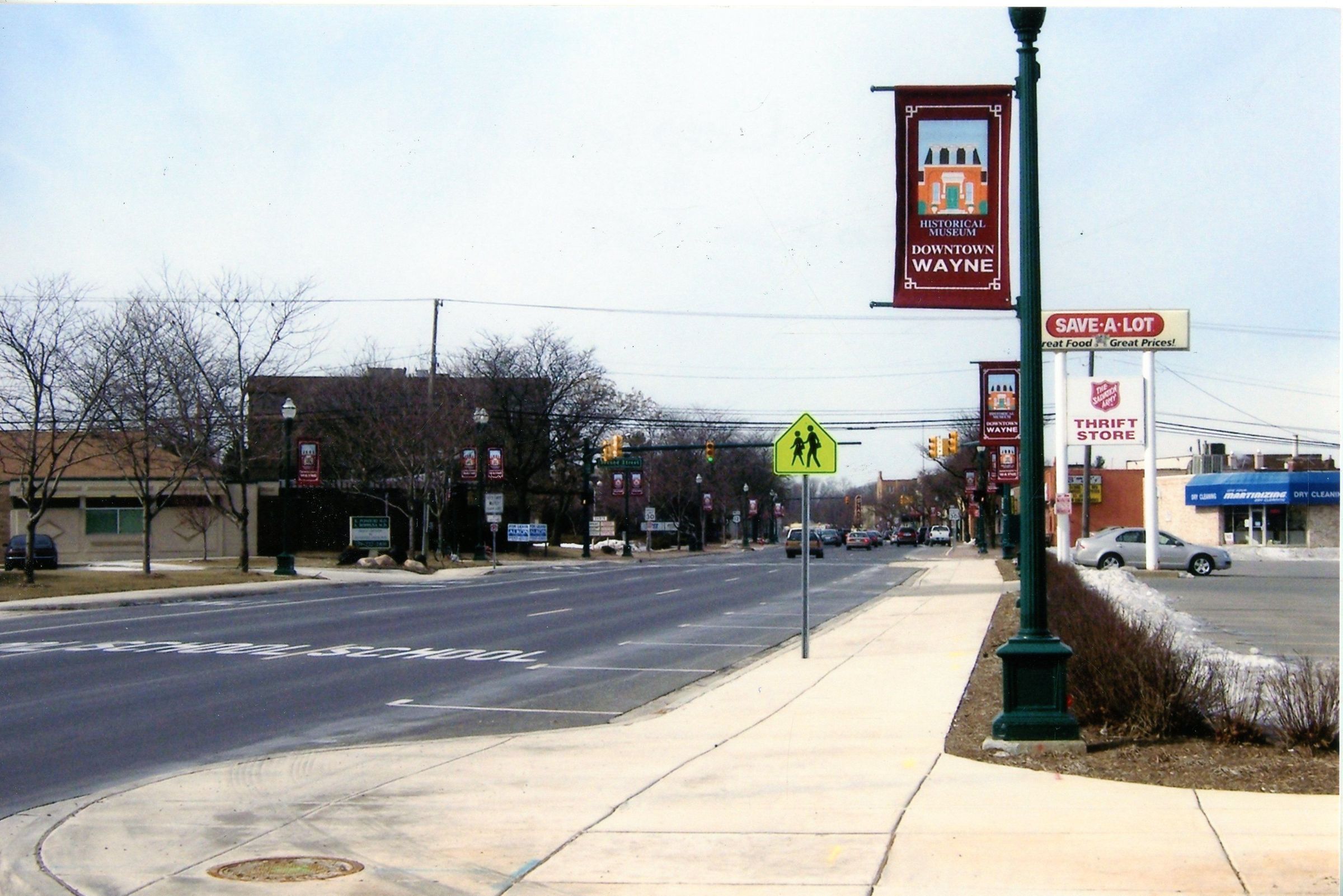 Michigan looking West from 3rd Street. Sav-A-Lot and Salvation Army store sign visible