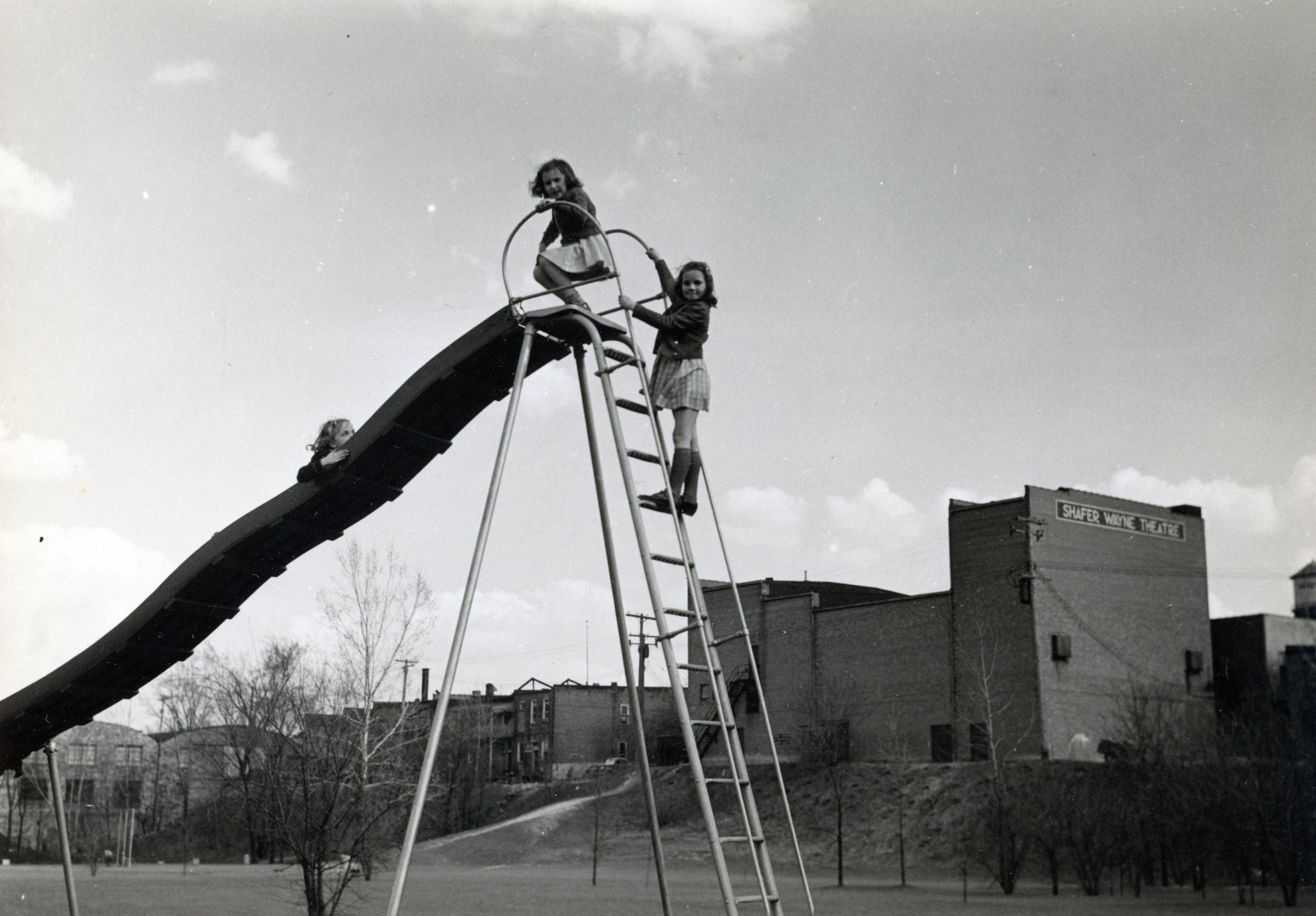 Three Girls On A Slide Behind The Shafer Wayne Theater