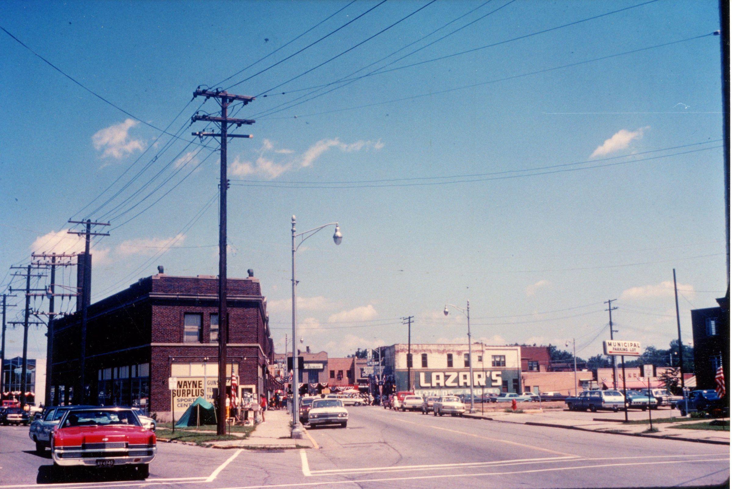 Looking North up Monroe from Intersection of Main and Biddle. Village hall at right. 1968. Urban renewal has started clearing buildings.Cataloged By