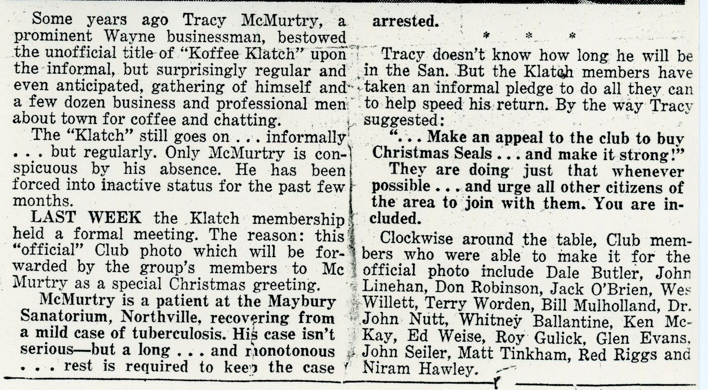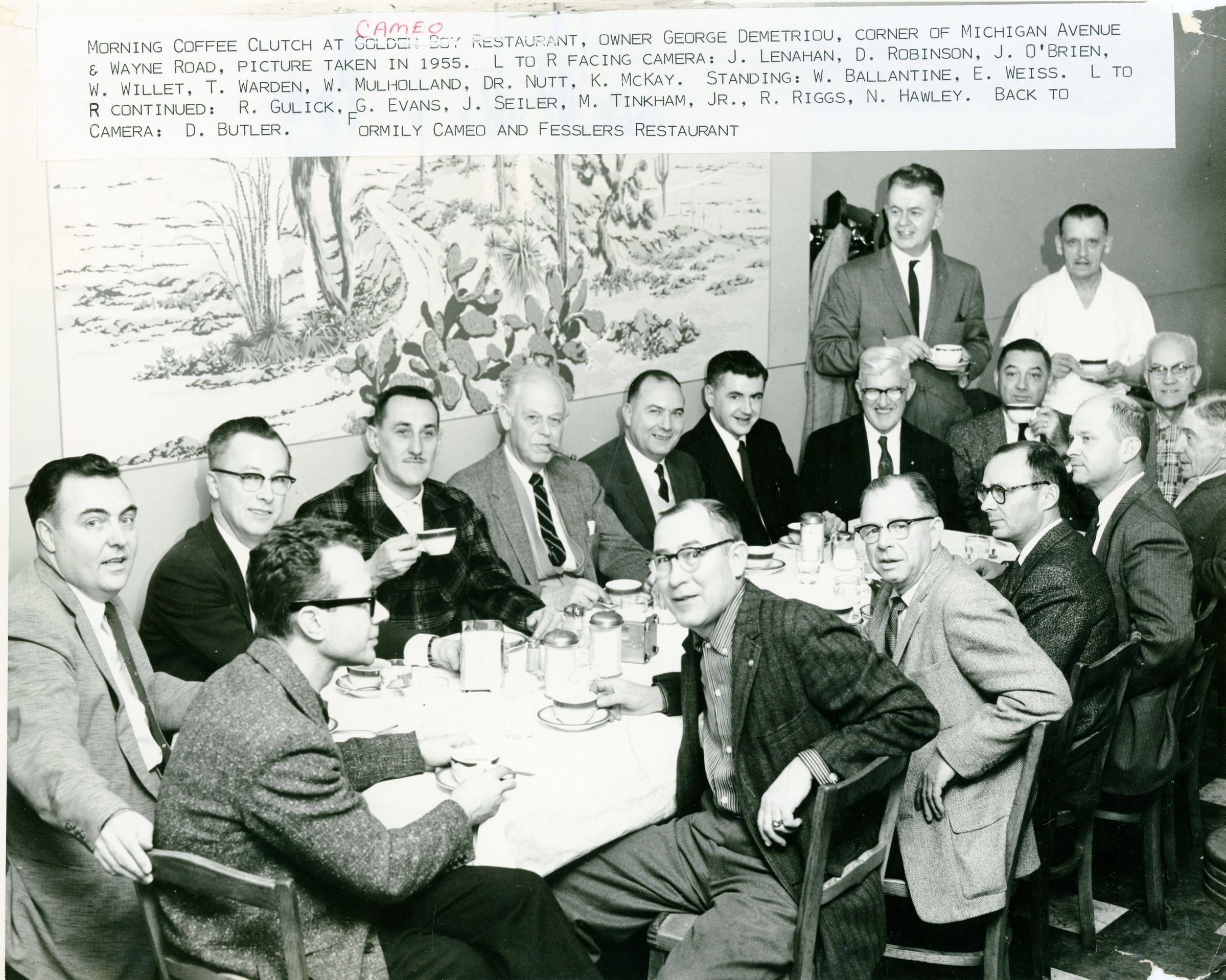 Koffee Klatch at the Cameo Restaurant, formerly Fesslers. Corner of Michigan and Wayne. (L-R facing camera) J Lenahan, D. Robinson, J O'Brien, W Willet, T Warden, W Mulholland, Dr. Nutt, K McKay, (Standing) - W Ballantine, E Weiss, (L-R facing camera continued) - R Gulick, G Evans, J Seiler, M Tinkham Jr, R Riggs, N Hawley, Dale Butler with back to camera.Cataloged By