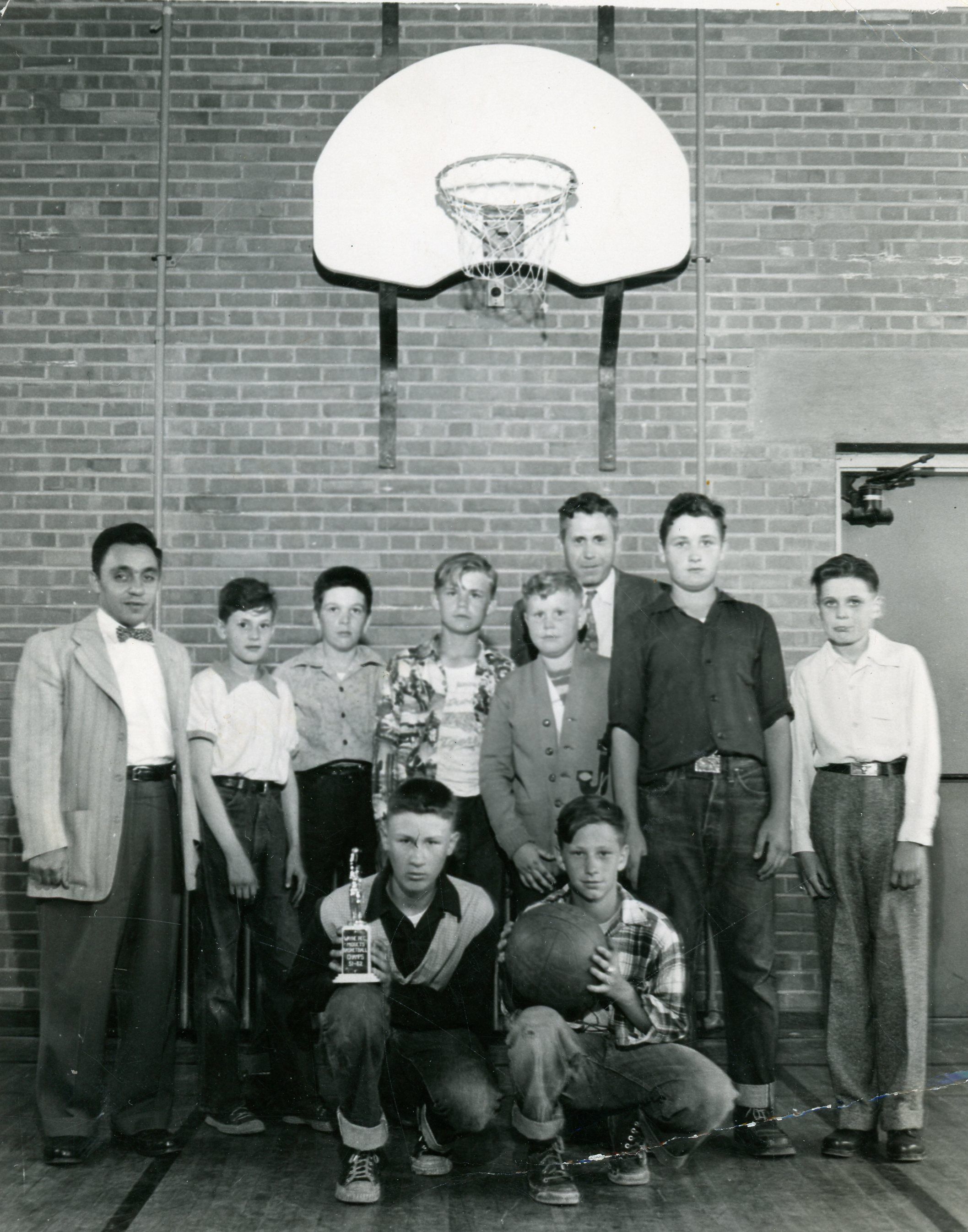 Jackson School 6th grade class 57, 58 or 59. (L-R) Mr. Yandrain, James Moers, UK, Paul Hunter, Rod Arvin, Mr. Arvin, Earle Lamp, Carl Renard, Elsther Ford, David Kelly.Cataloged By