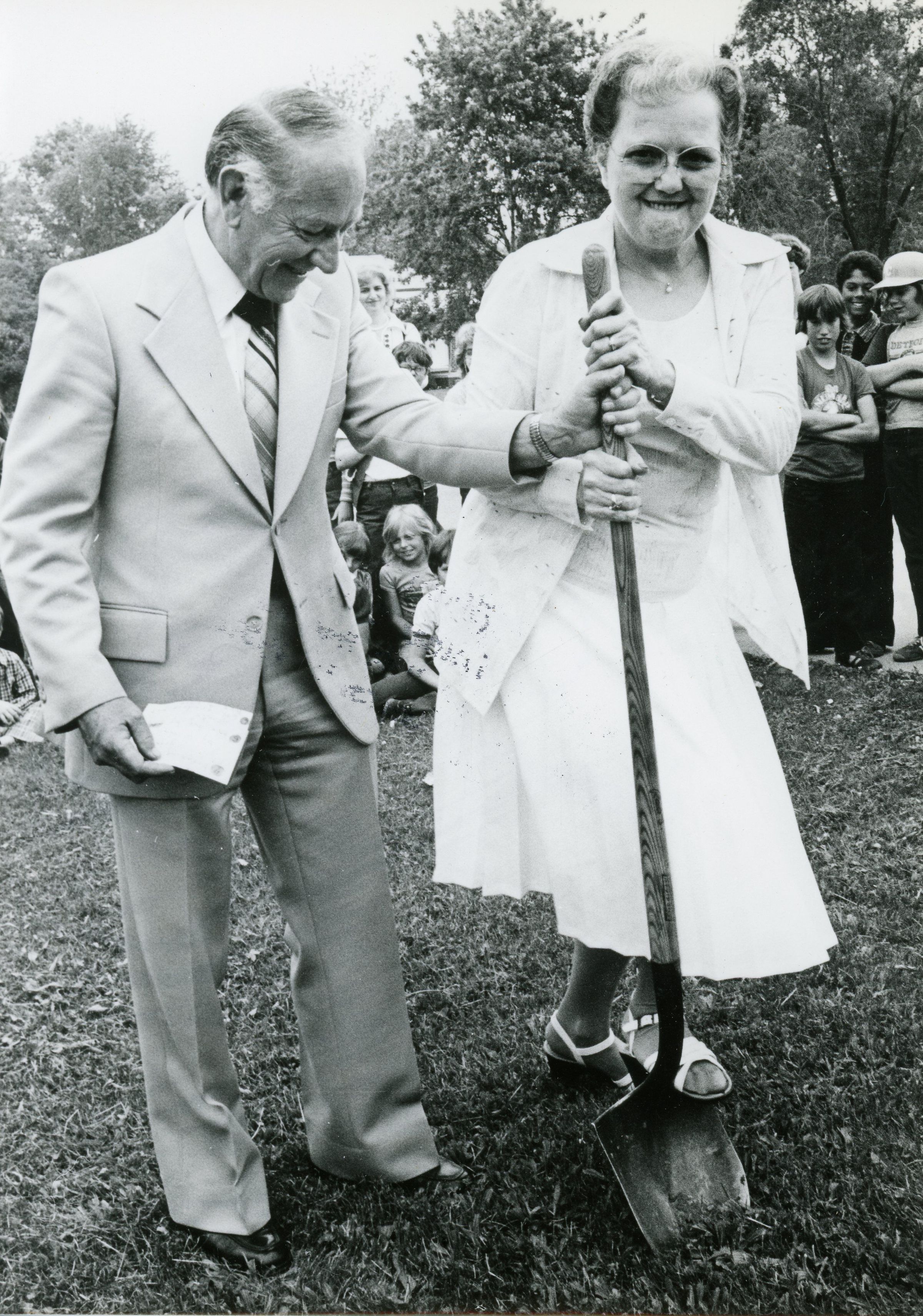 Roosevelt Elementary School. Principal Dave Smith and Wilma Cartright plant a tree for Wilmas retirement.