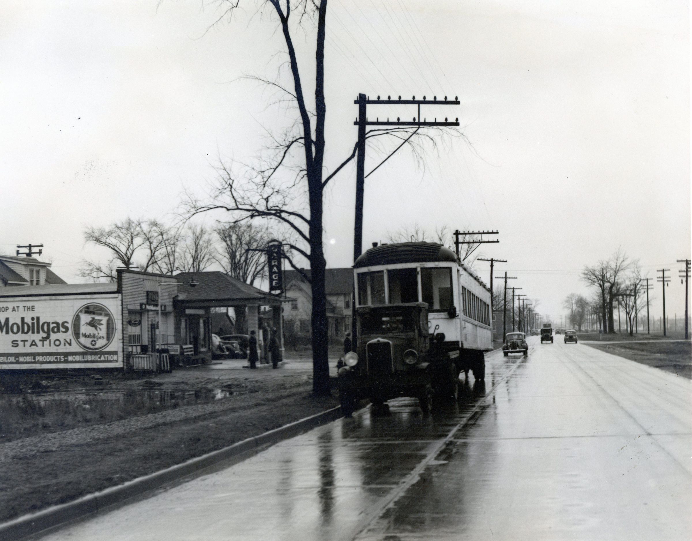 Last streetcar through Wayne. 1929. Michigan Avenue westbound. Mobil gas station pictured.