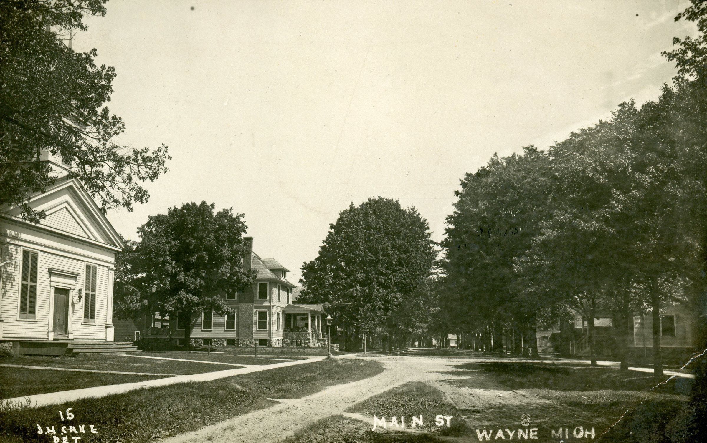 Main looking East at Washington (Wayne Rd.) Congregational Church 35106 Main at left, Prouty/Davidson House 35042 Main. 1909
