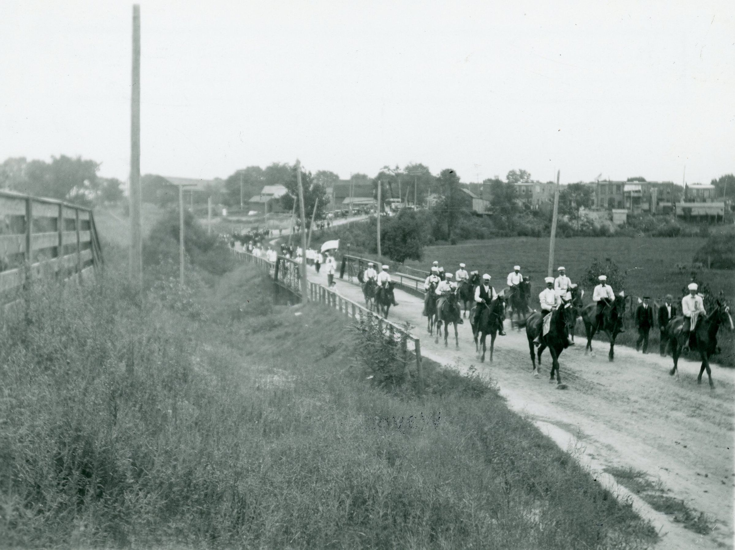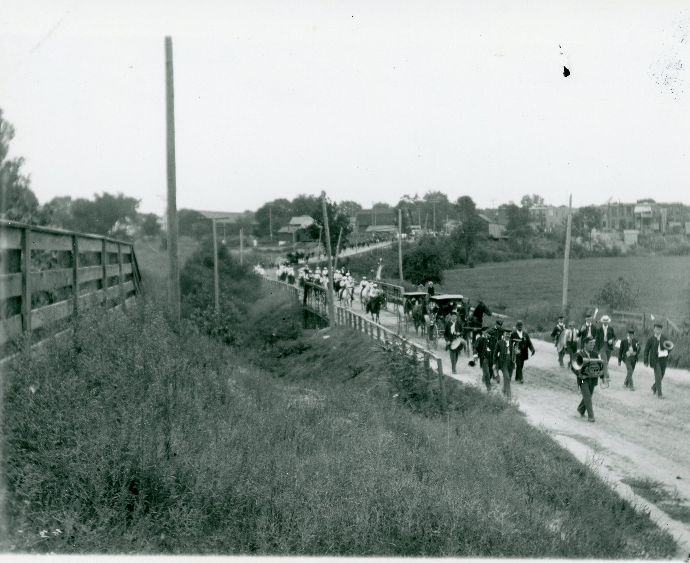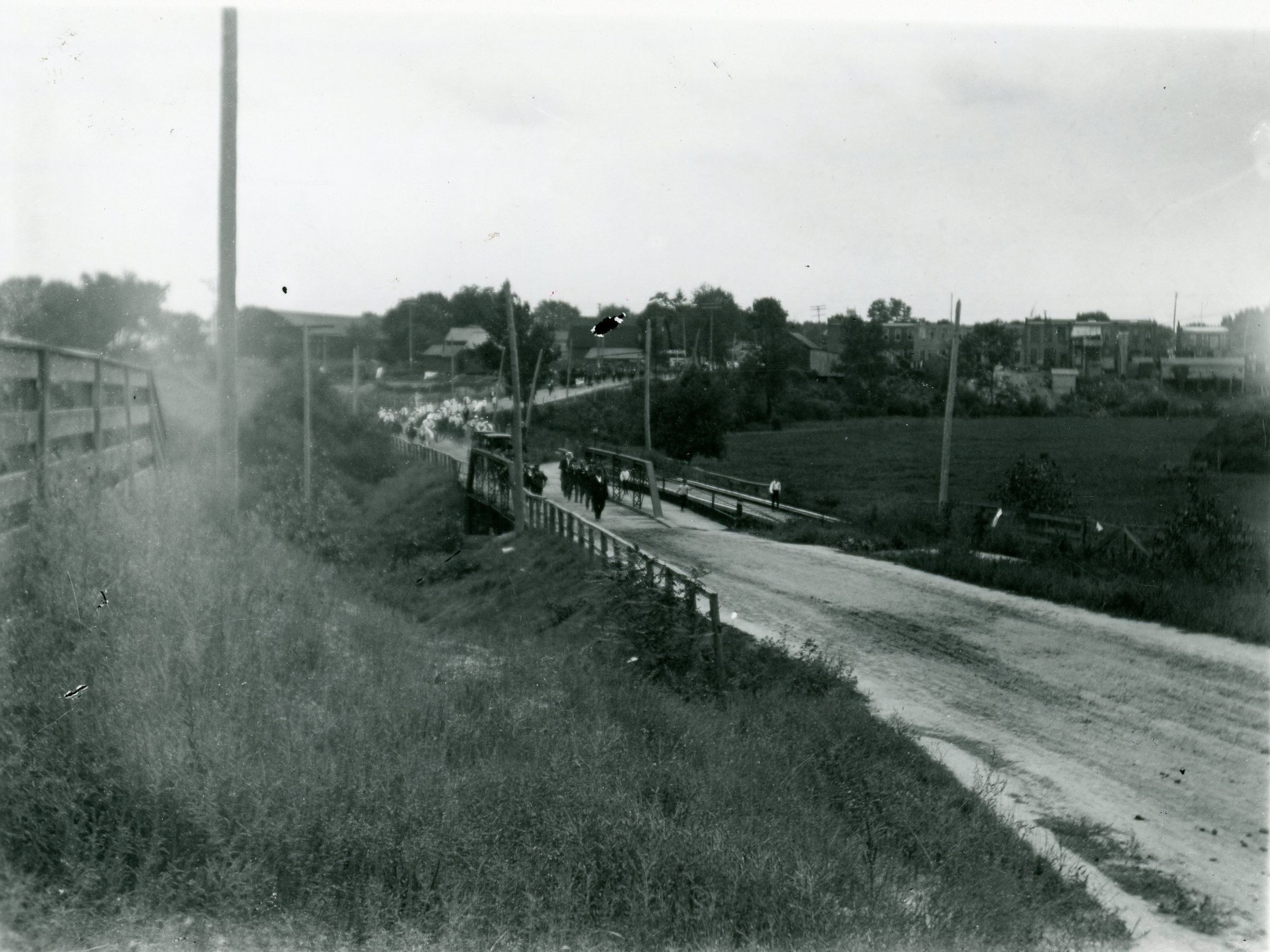 Wayne road over bridge, looking South. about 1900. 4th of July Parade heading north over bridge. Photo taken from near Ash Street.Cataloged By