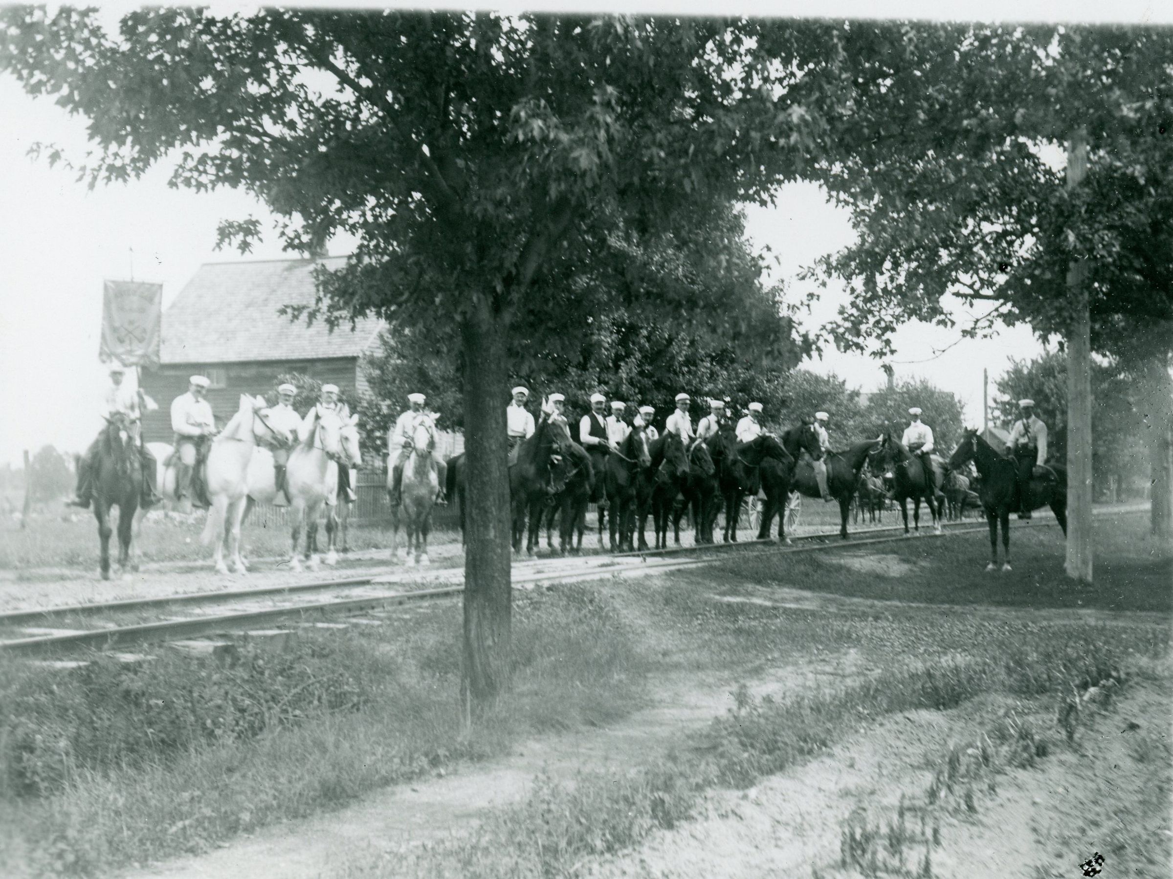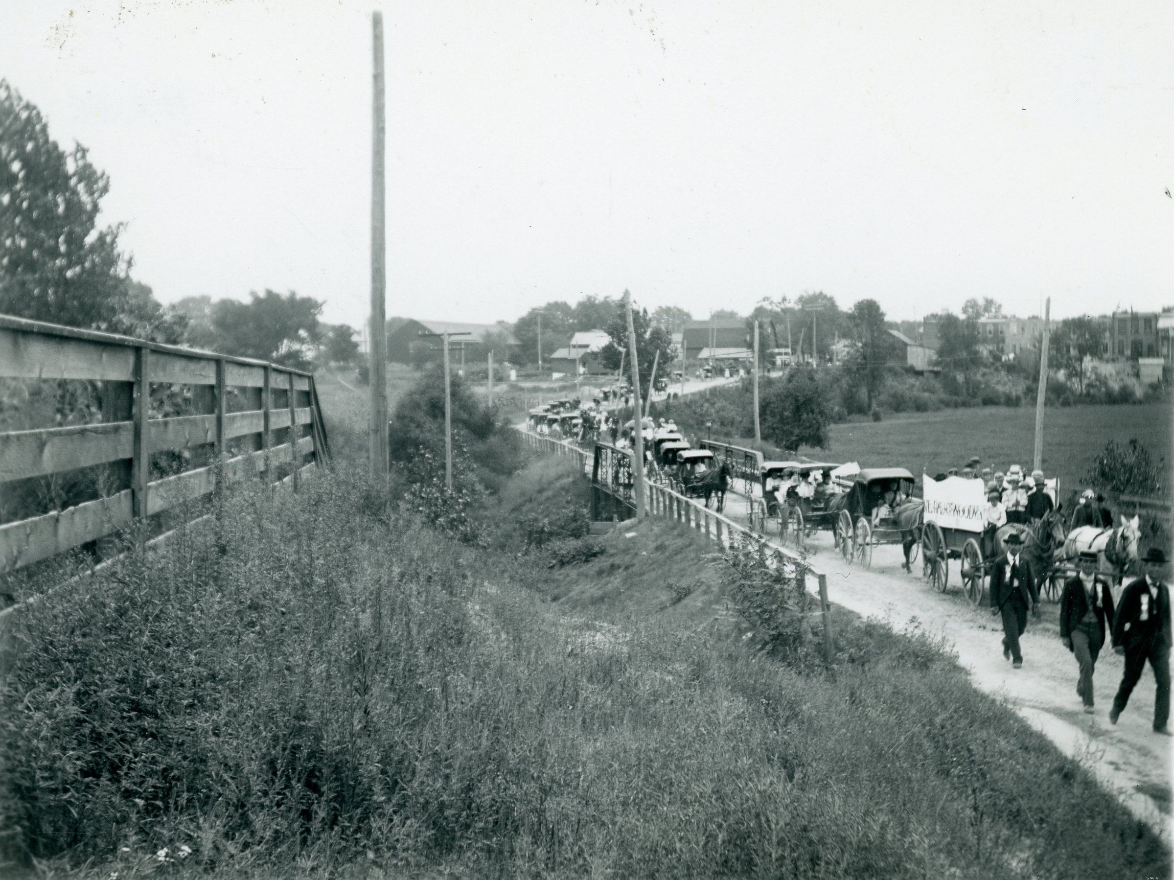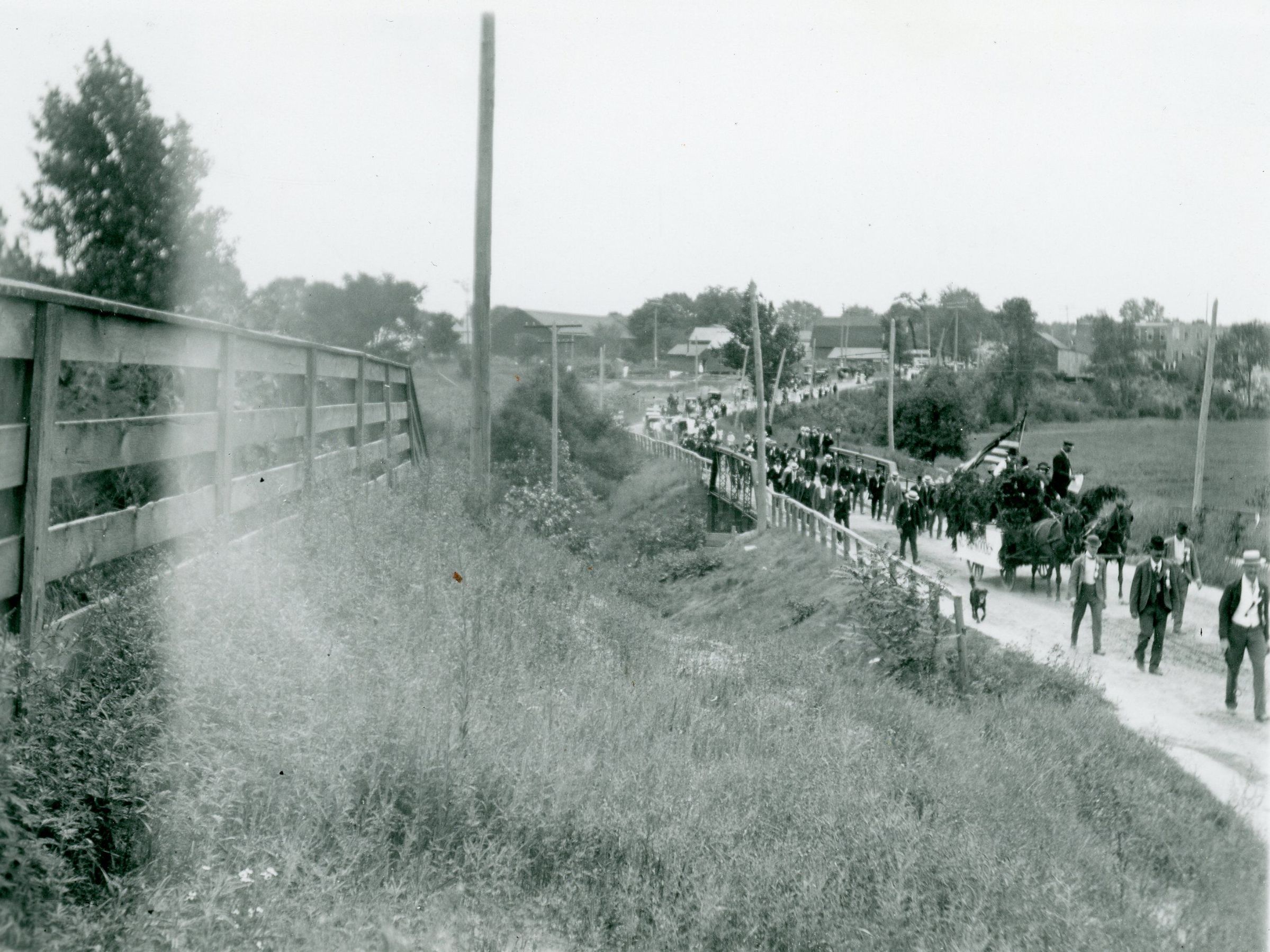 Wayne road over bridge, looking South. about 1900. 4th of July Parade heading north over bridge. Photo taken from near Ash Street.Cataloged By