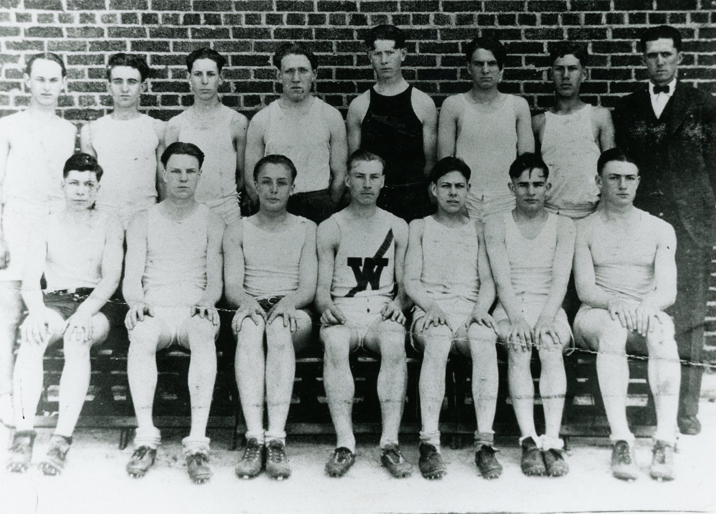 1926 WHS Track Team. Front Row L to R: Eugene Hawkens, Roland Smith, Leo Schroder, Bill Johnson ( Baptist Mins Son), Harold Langworthy and John Vallance. Back Row L to R: Alfred Morton, Mike Kolarfo, Carl Squire, Floyd Johnson, Hector Ross, Ray Fair, Hank Goudy and Coach G.R. Fuller. Identification by France Crook on 3/1976, Jack Coplis on 07/21/79 and Hank Goudy.Cataloged By