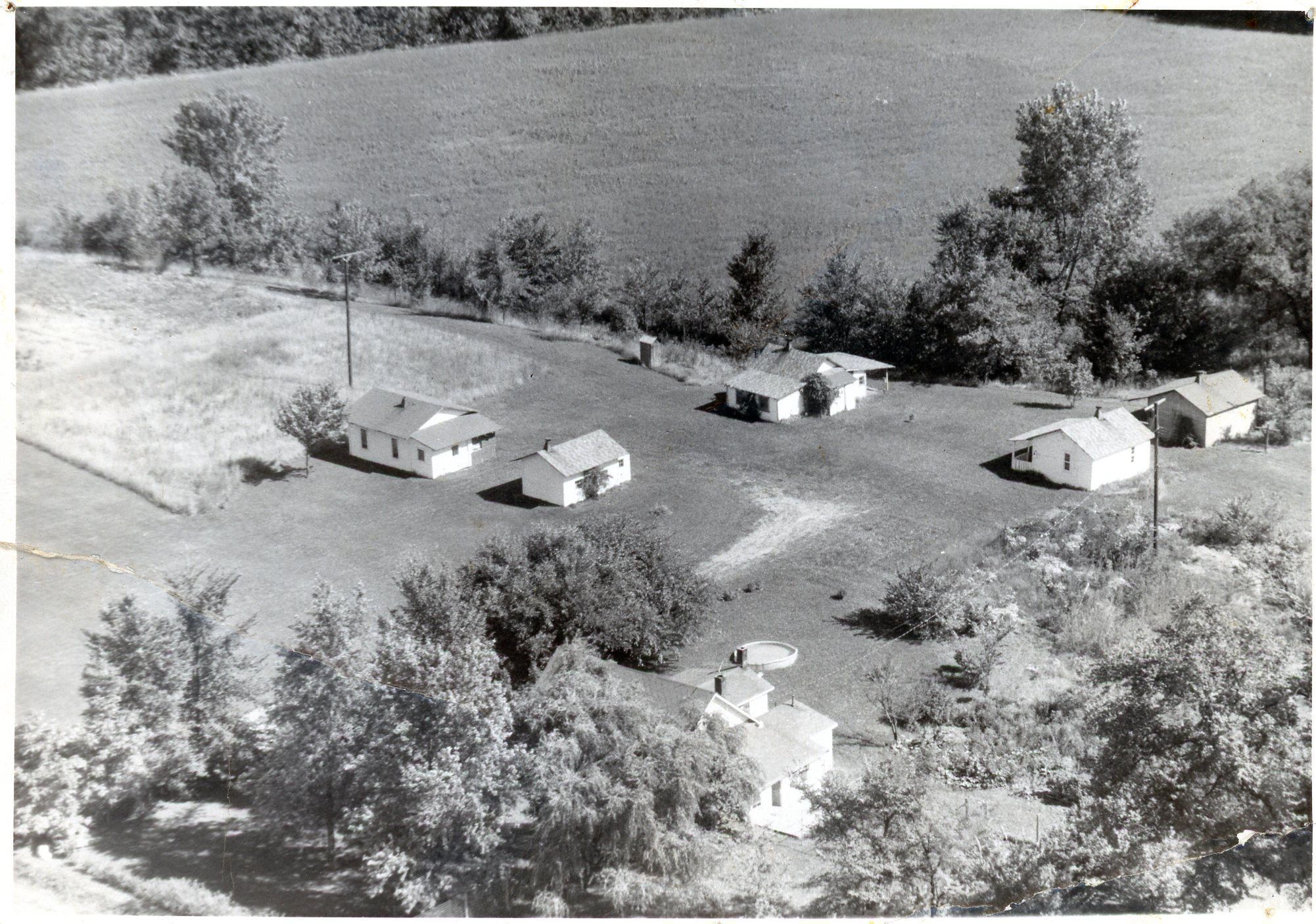 Aerial over Carpenter Lake cabins, 1957. Lake was in field at top of picture.