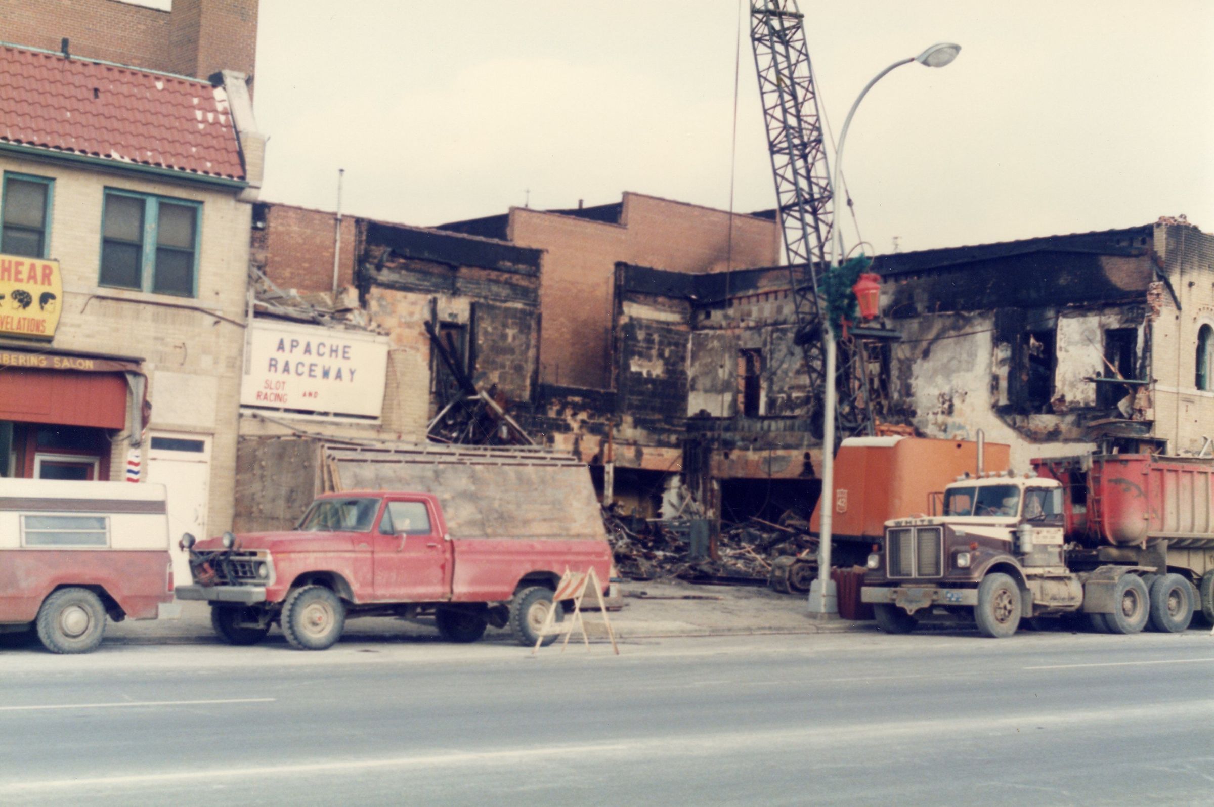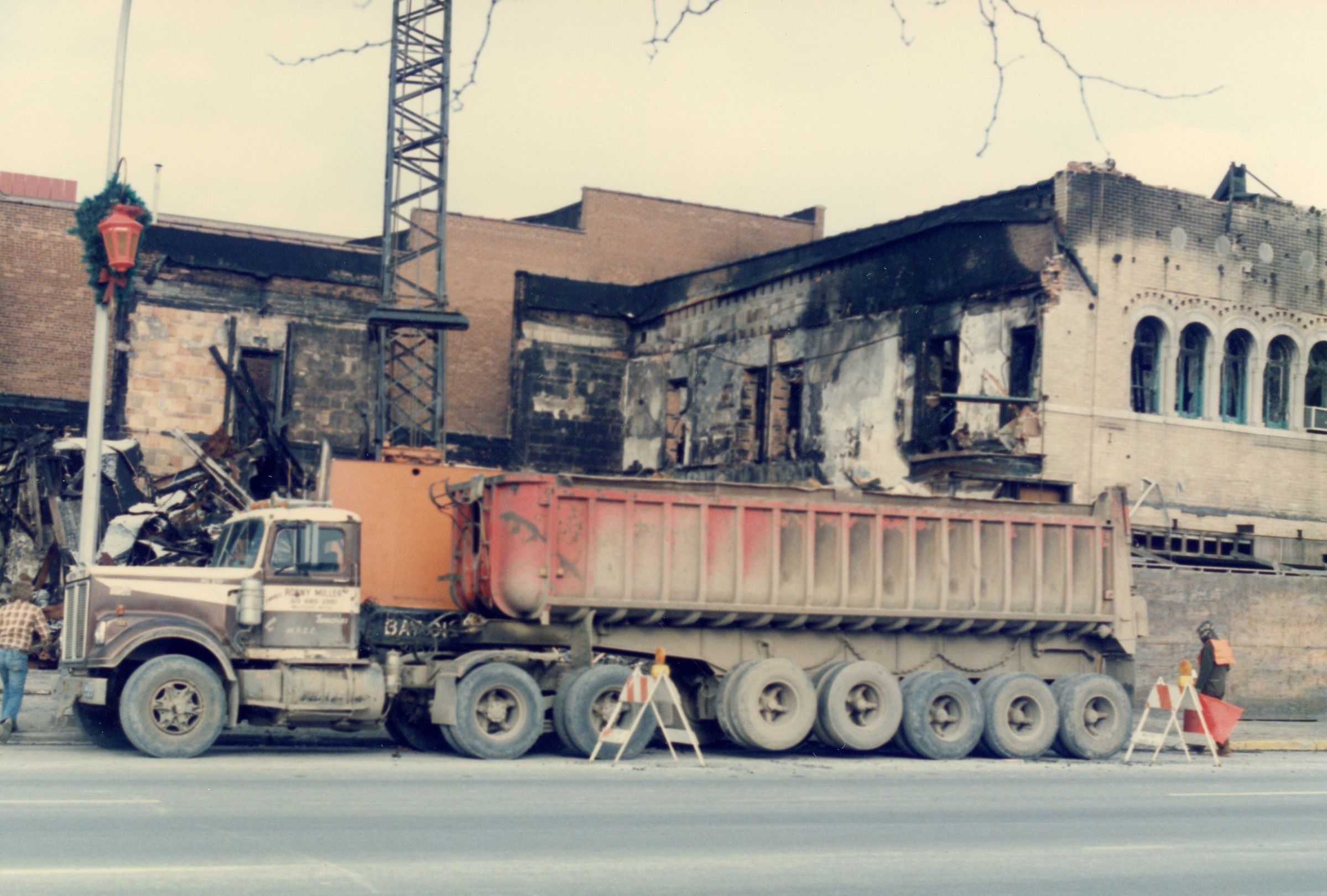 Front of Wayne Theatre being taken down after April 1985 fire. Rear auditorium survived.