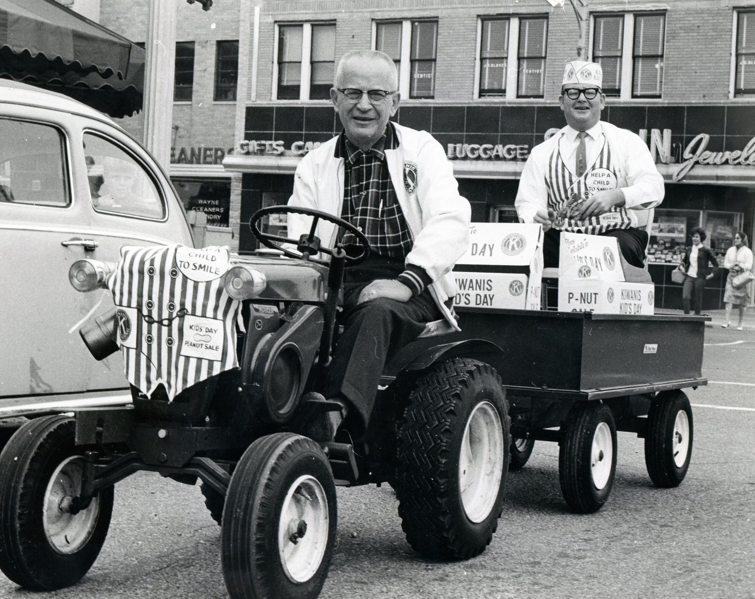 Floyd Neel and Richard Spizak driving a tractor float on Kids day peanut sale on Monroe Street