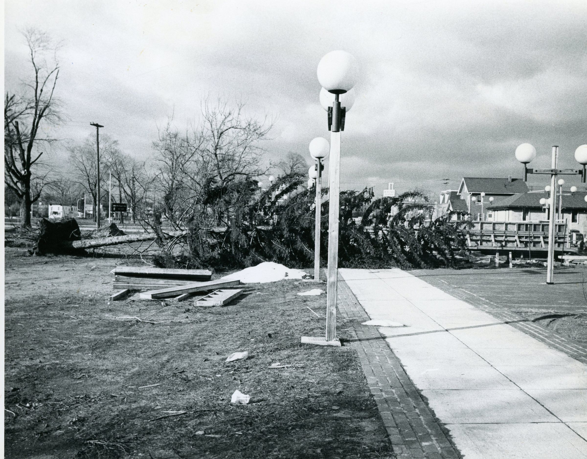 Fallen tree at Veteran Plaza, looking west down Main Street. Congregational church and parsonage visible at right. Lothar Konietzko photo