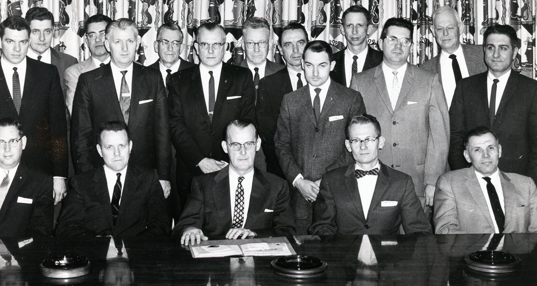 Ford Motor Co Executives meet at the Lincoln-Mercury plant on MI Ave in Wayne, Michigan. They met for JA promo in Feb 1960. Picture is from "The Wayne Eagle".Cataloged By