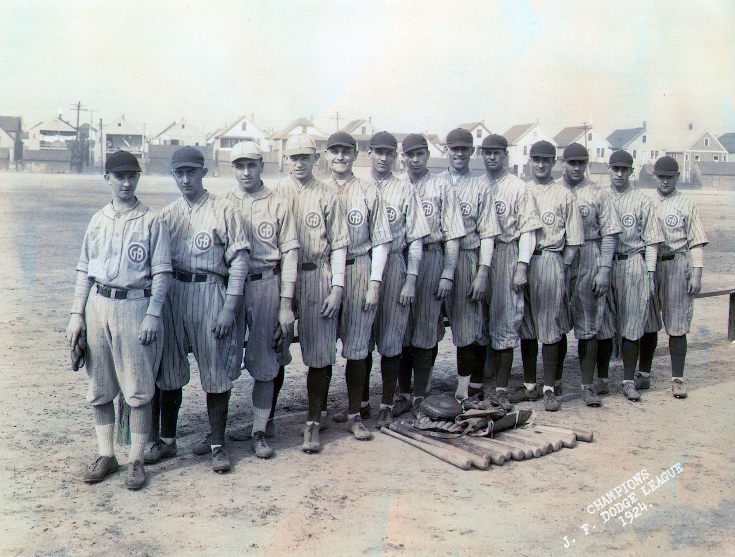 Champions J.F. Dodge League Baseball Players. From left to right, number 6 is France Burger( the pitcher), Rush Burger is number 10 from the left and Steve Burger is number 11 from the left. This Photo was taken in 1924.Cataloged By