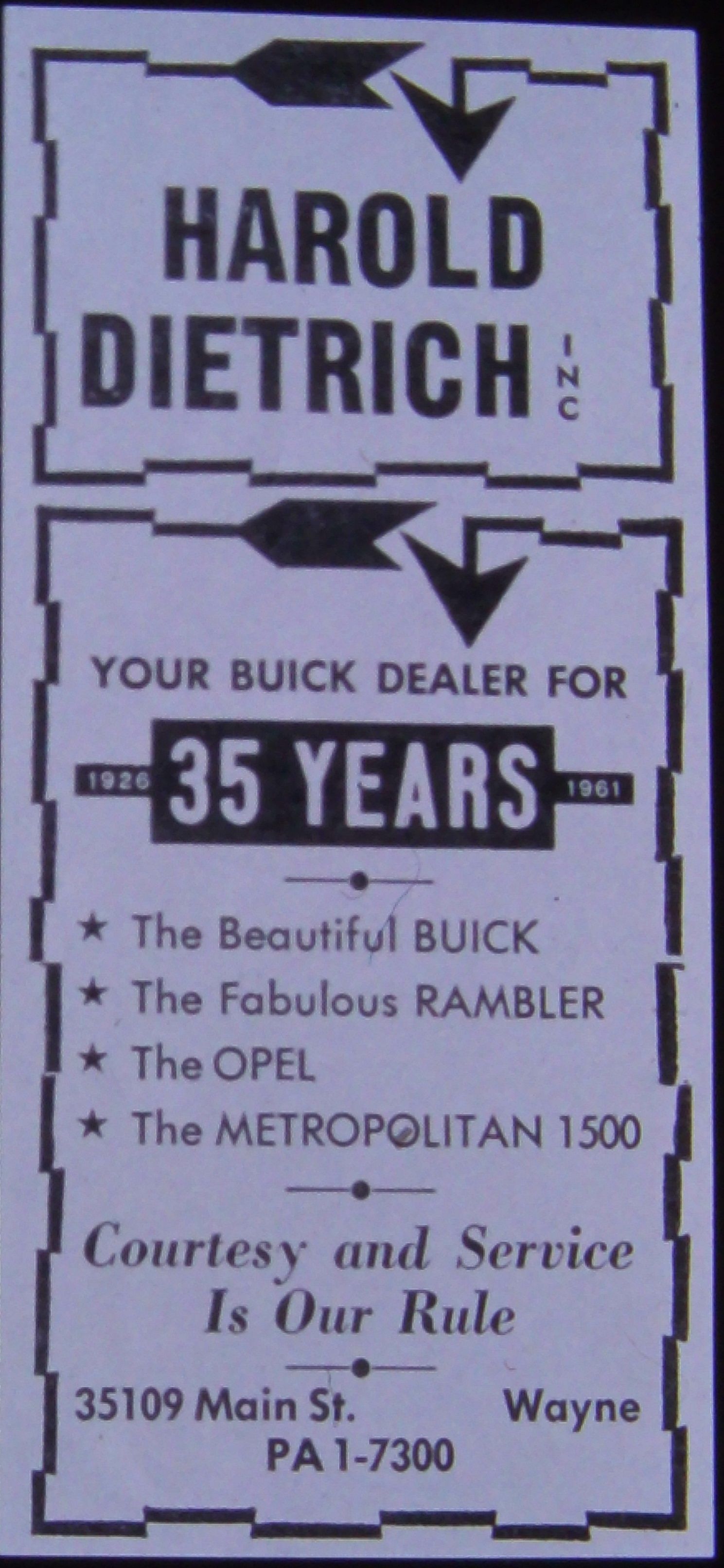 35109 Main. SW corner Main and Washington. Harold Dietrich Inc. a Buick auto dealer at 35109 Main St. Wayne, MI 48184