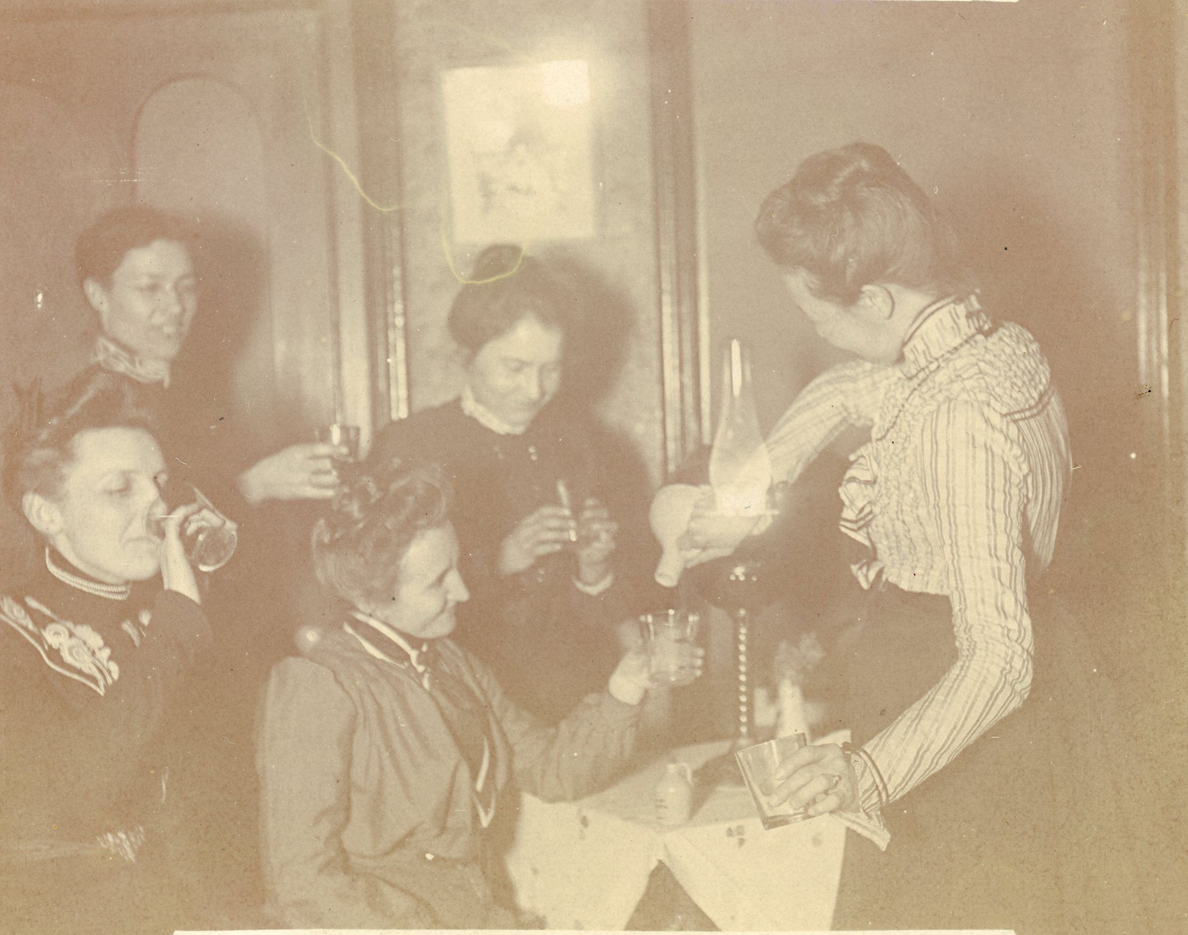 Spinster Club Members having a drink. From top row Left to Right: Mammie Chaffee, Floy Warner and Pouring is Ida Collar. Front Row from Left to Right is: Alice Cady and Emma John.Cataloged By