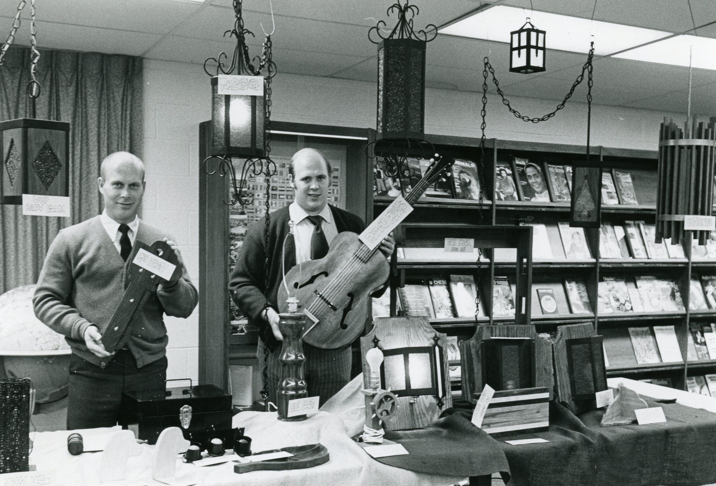 Ben Franklin School. Things made by students on display in library, 1970. Mr. Kaufman on the right Mr. Baker on the left. Both were Shop teachers and coaches of the 70s at Franklin Junior High.