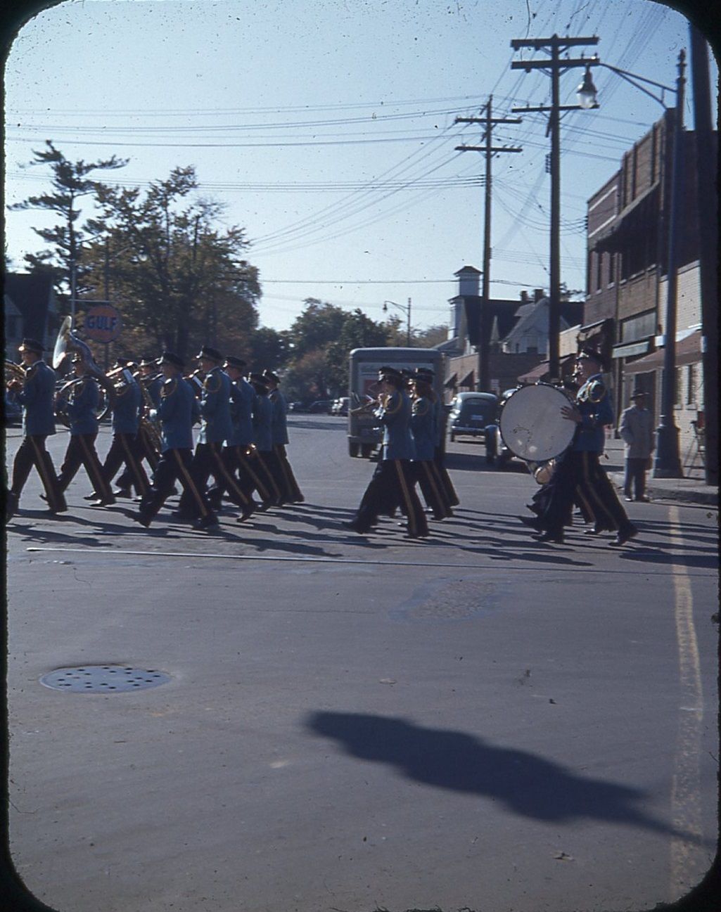 WHS Band walking across Wayne road - 1948. Looking South from Michigan