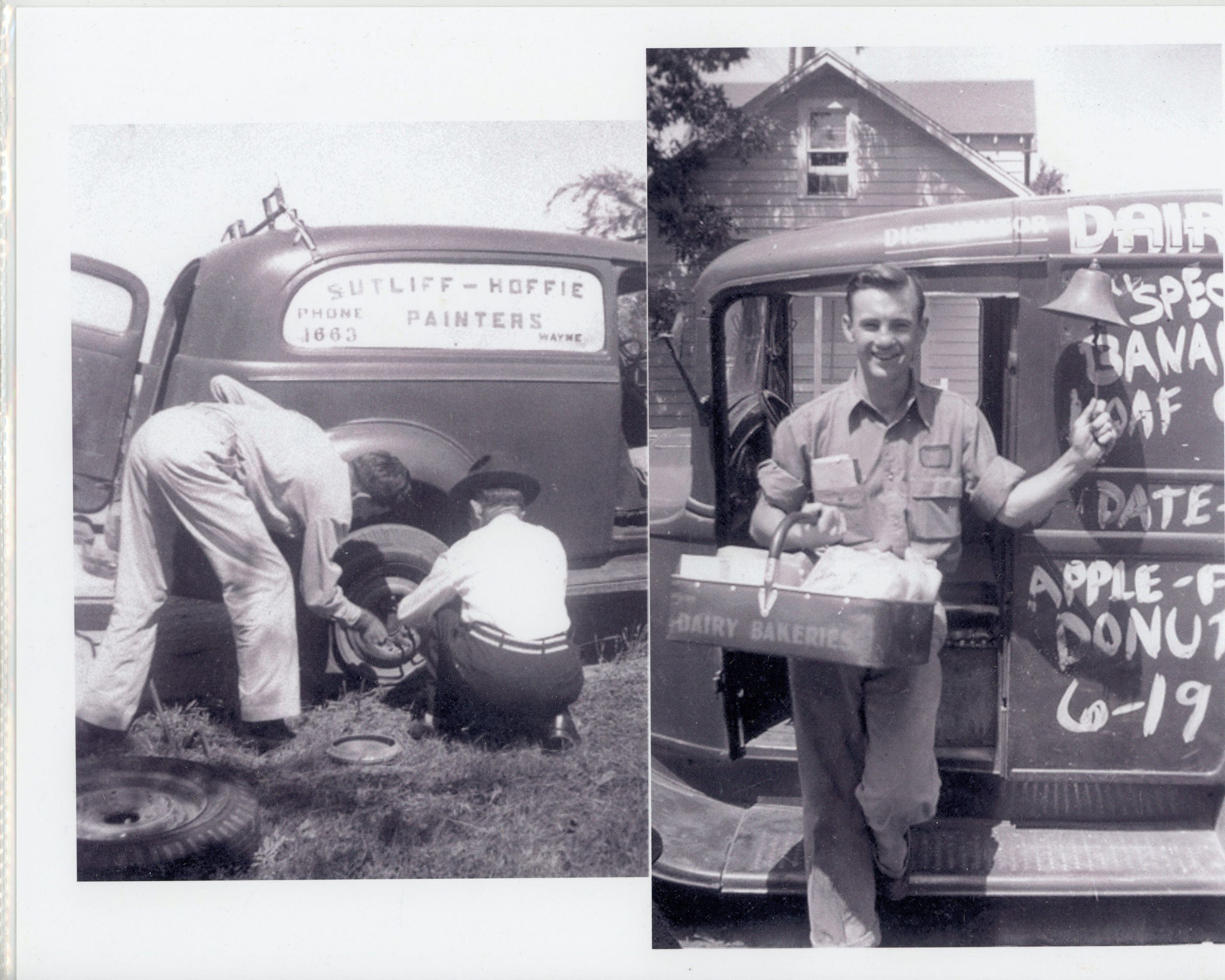 Sutliff Hoffie Painters. L-R: Charles E. Sutliff, son-in-law John Warlow, 1945. Walter Sutliff ("door-to-door") delivery work truck "Dairy Bakery," village of Wayne.