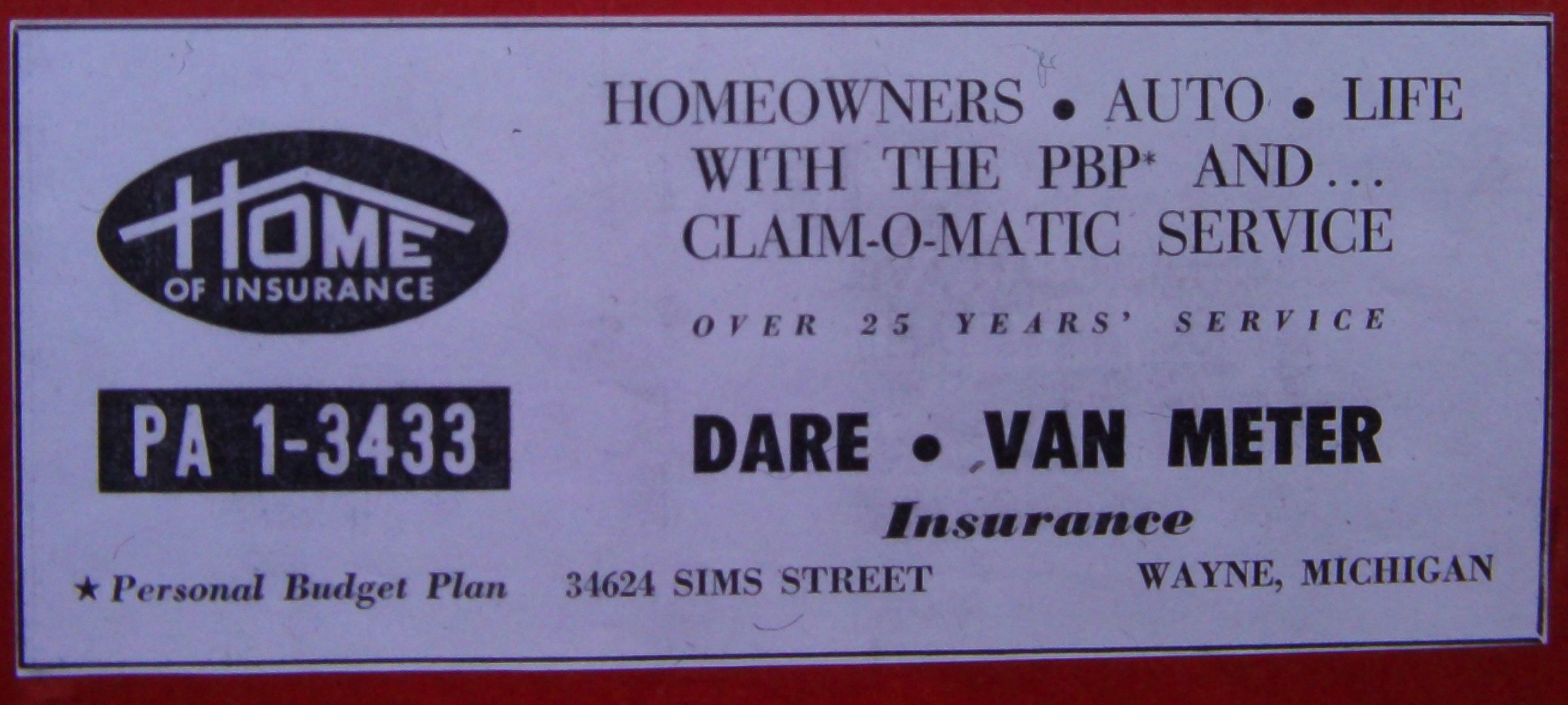 Home of Insurance - 34624 Sims. Dare, Van Meter. 1961 ad. Home torn down for parking lot.