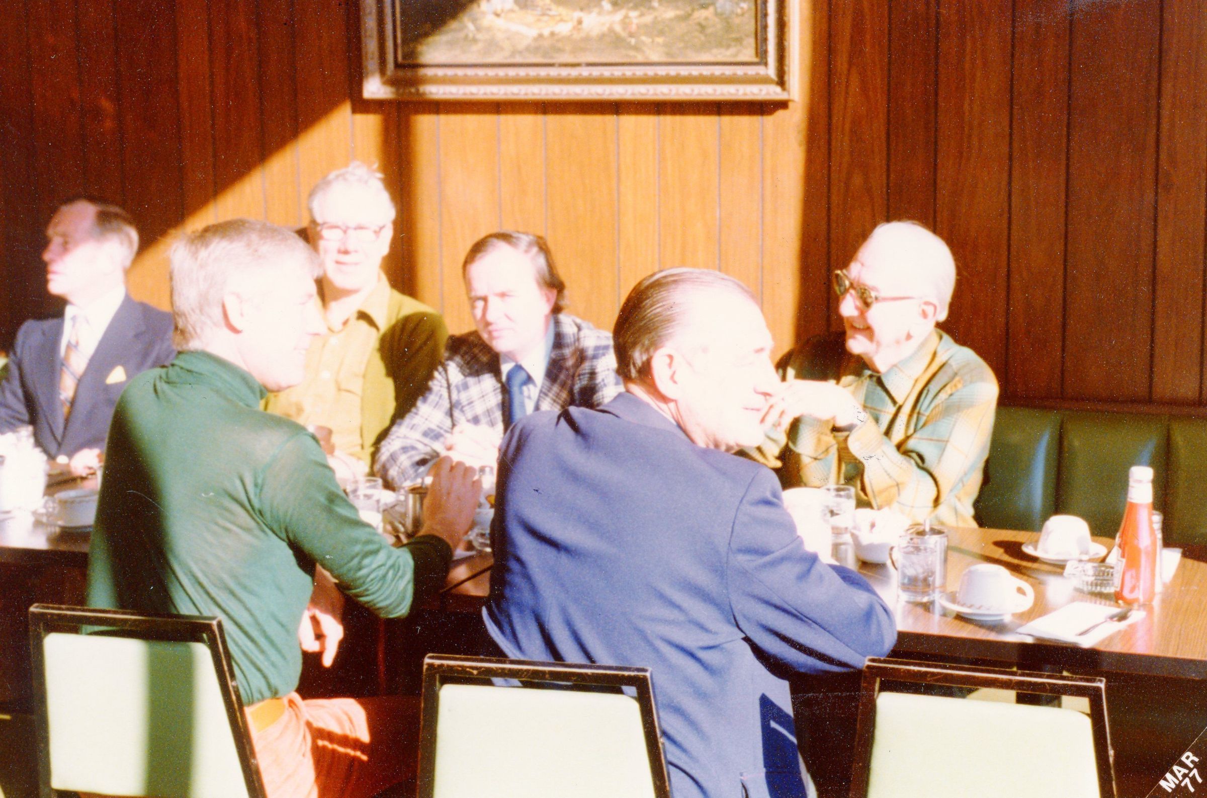 Koffee Klatch, George Smith, Hank Goudy, Pat Norton, Hoppie Arthur. (Back to Camera) - Jerry Hyatt, John Vallance