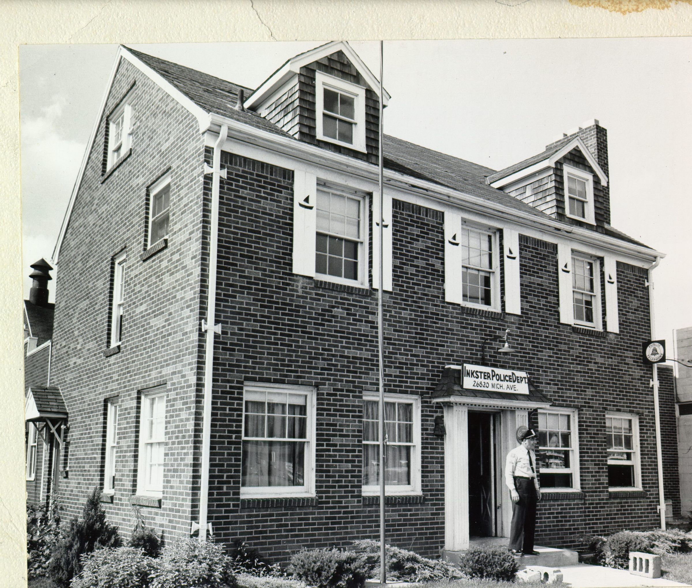 26820 Michigan - Inkster Police Department Station. Inkster Police Department in 1930's with Officer standing in front doorway. Possibly Fritz Blossingham, Chief of Police at the time. Building is no longer standing. East of Inskster Road on Michingan Avenue on North Side. 1960's was taken down and a parking lot for frozen food store was built. New Police Station was built Westwood Inn outside pavillion built around 1934. Dances with Jan Garber and Horace Heidt Gene Krupa Bands. Henry Ford appeared there, people dressed up to go out and dance and drinks. Gloria Steele's mother Violet Jacobs worked as a waitress for a short time and waited on Henry Ford.Cataloged By