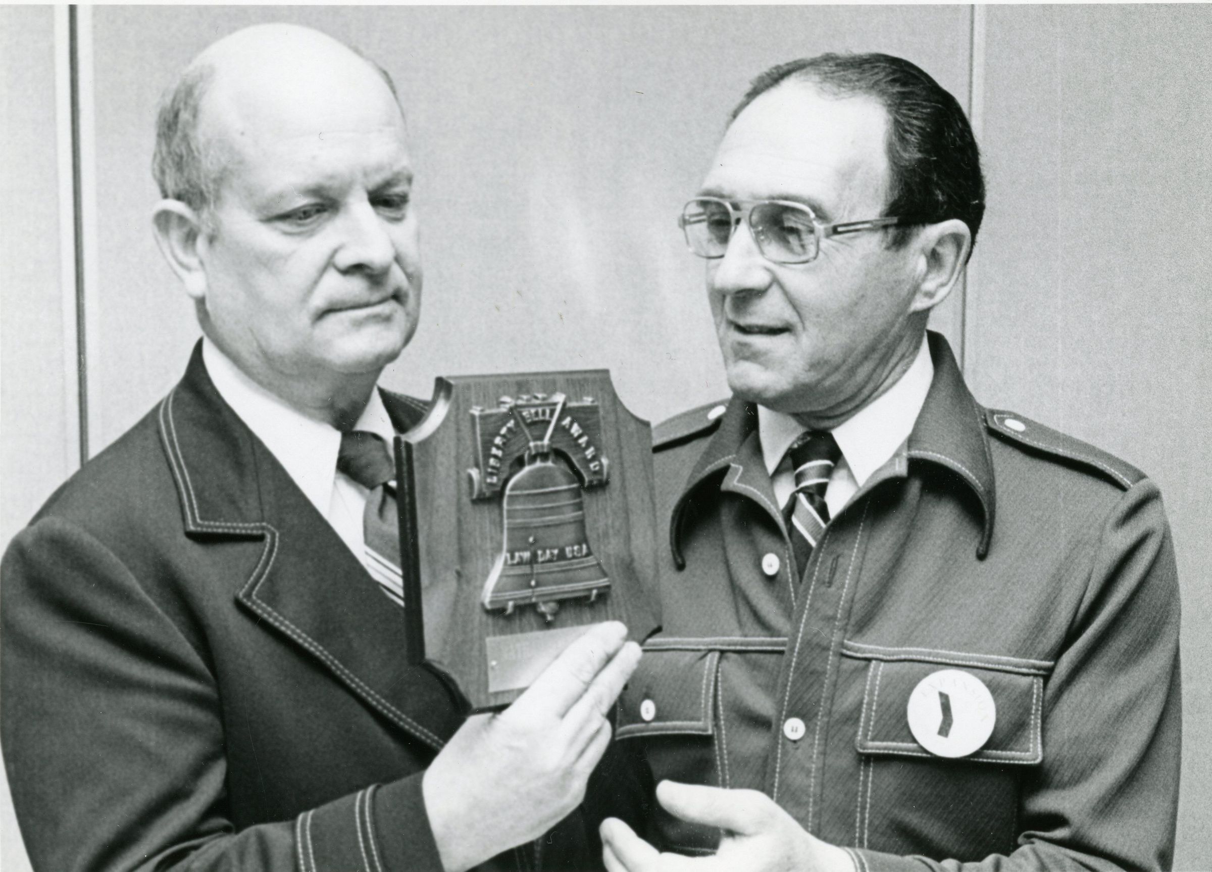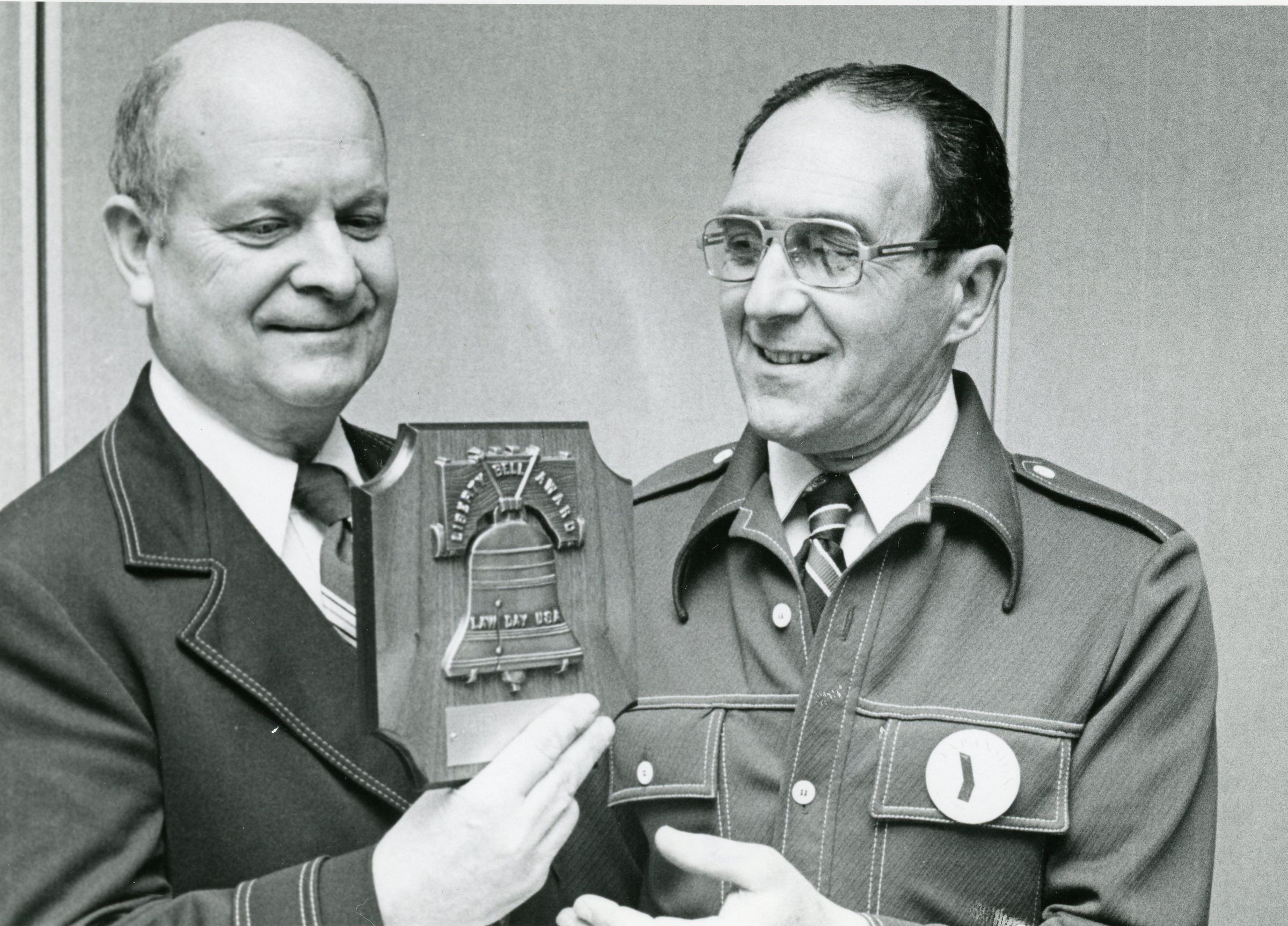 Rotary members, Mr. Seiler and Nate Weiser with Liberty Bell Award. Photo taken by Lothar E. Konietzko.Cataloged By
