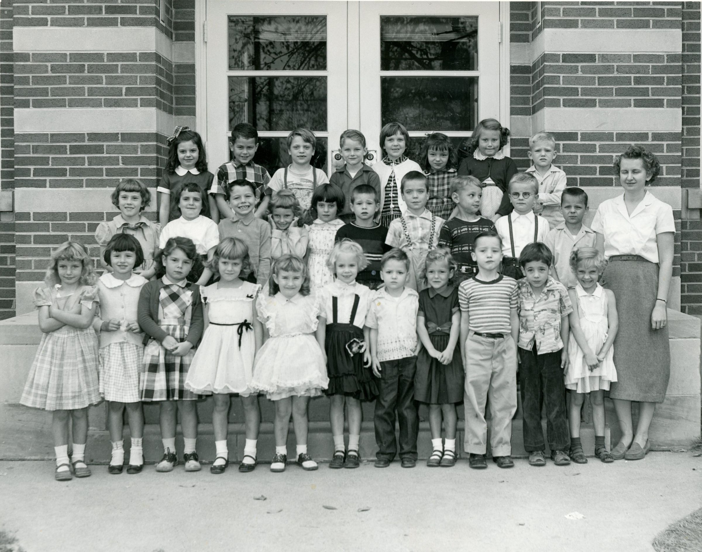 Washington School 1st Grade October 1956. Mrs. Ball. Back Row: Paula, Tommy Lee, Douglas May, Timmy Yates, Susan Smith, Kathy, Karen Woodwork, Timmy Carpenter. Middle Row: Janice Foggerty, Jane Goudy, Ronnie, Phyllis, Jessica Chabot, Michael, Terry Welch, Danny Sills, David Tagg, Kenneth Kuhn. Front Row: Helen Broom, Sheril Eiten, Susan Hannon, Gloria Jean, Margie Carter, Martha Jacobs, Jimmy Hudson, Diane, Charles, Freddie Snyder, Judy.Cataloged By