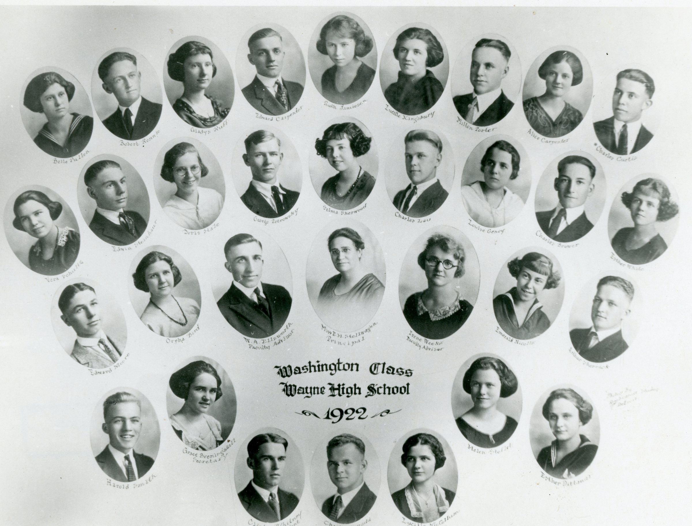 Wayne High School Class of 1922. L-R. Top Row: Belle Pullen, Robert Rennie, Gladys Ruff, Edward Carpenter, Ruth Jamieson, Lucille Kingsbury, Milton Porter, Alice Carpenter, Charles Curtis. Second Row: Vera Schultz, Edwin Steinhaur, Doris Hale, George Petrowsky, Selma Sherwood, Charles Lau, Louise Geney, Charles Brower, Esther White. Third Row: Edward Moore, Orpha Bird, W. A. Ellsworth, E. H. Stellwagen, Irene Weeks, Emerald Nicolls, Arthur Sherrick. Bottom Row: Harold Smith, Grace Breningstall, Clinton Whitney, CHarles Cozadd, Lucille McCollum, Helen Stoflet, Esther Dittmar.Cataloged By