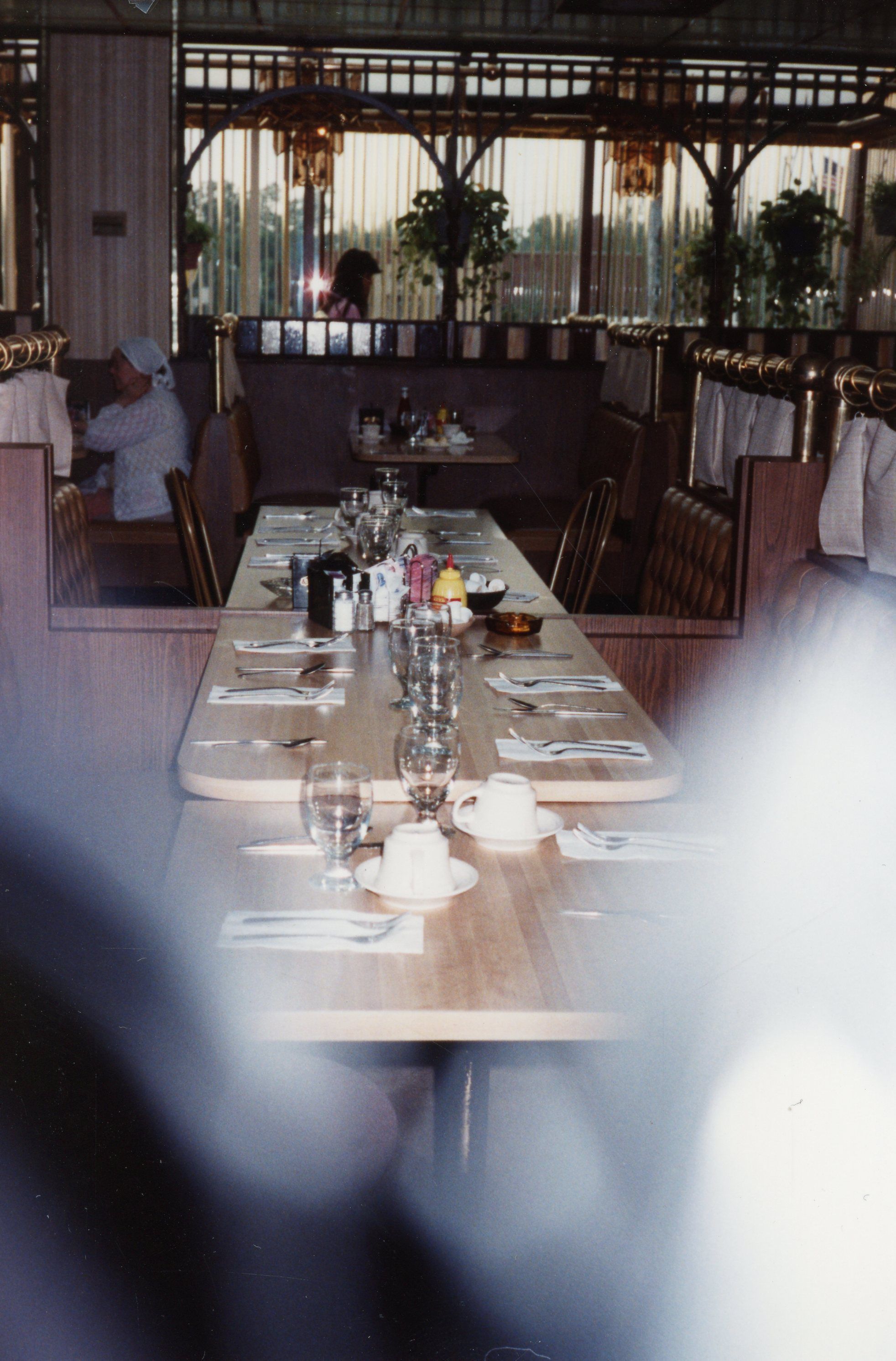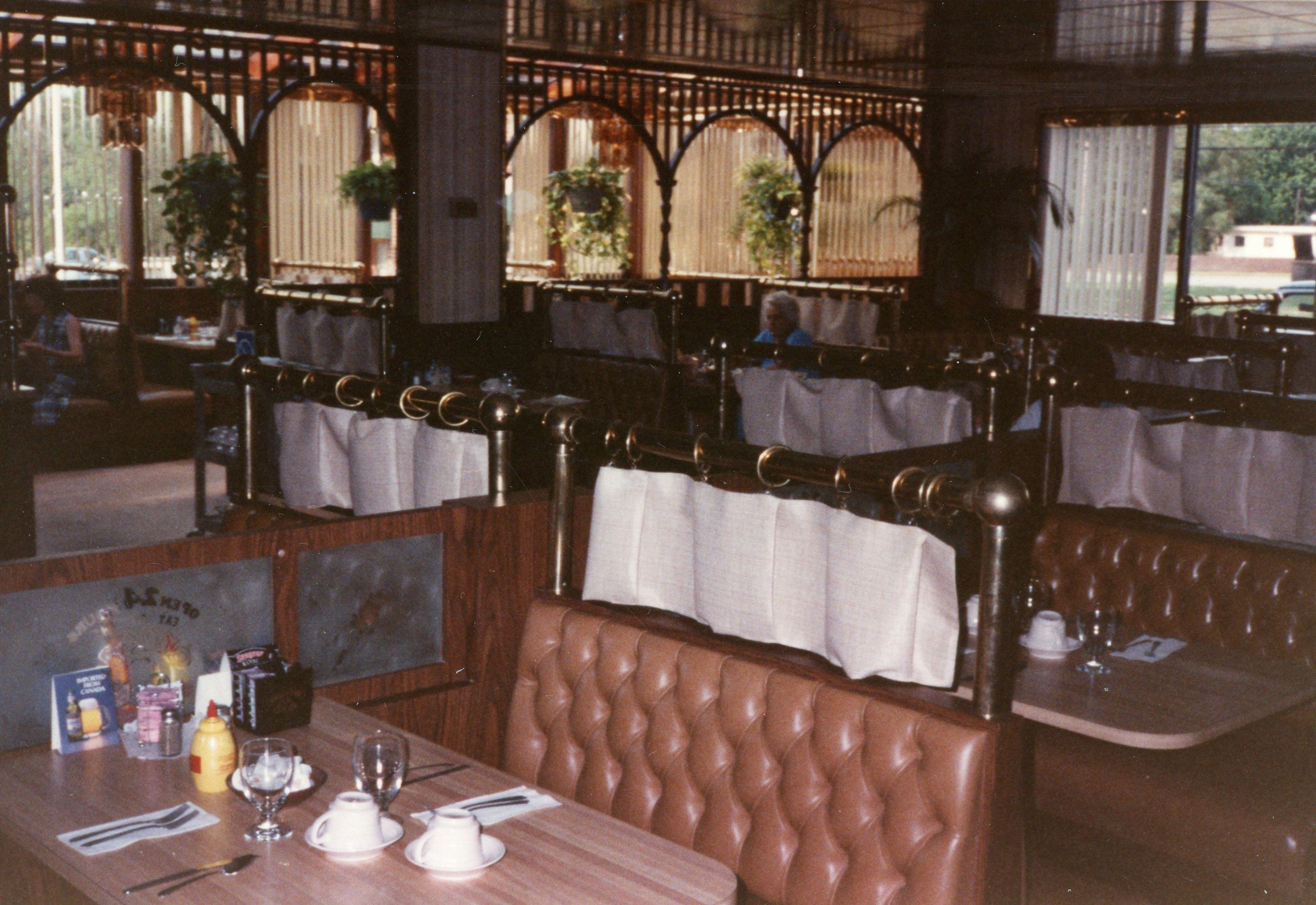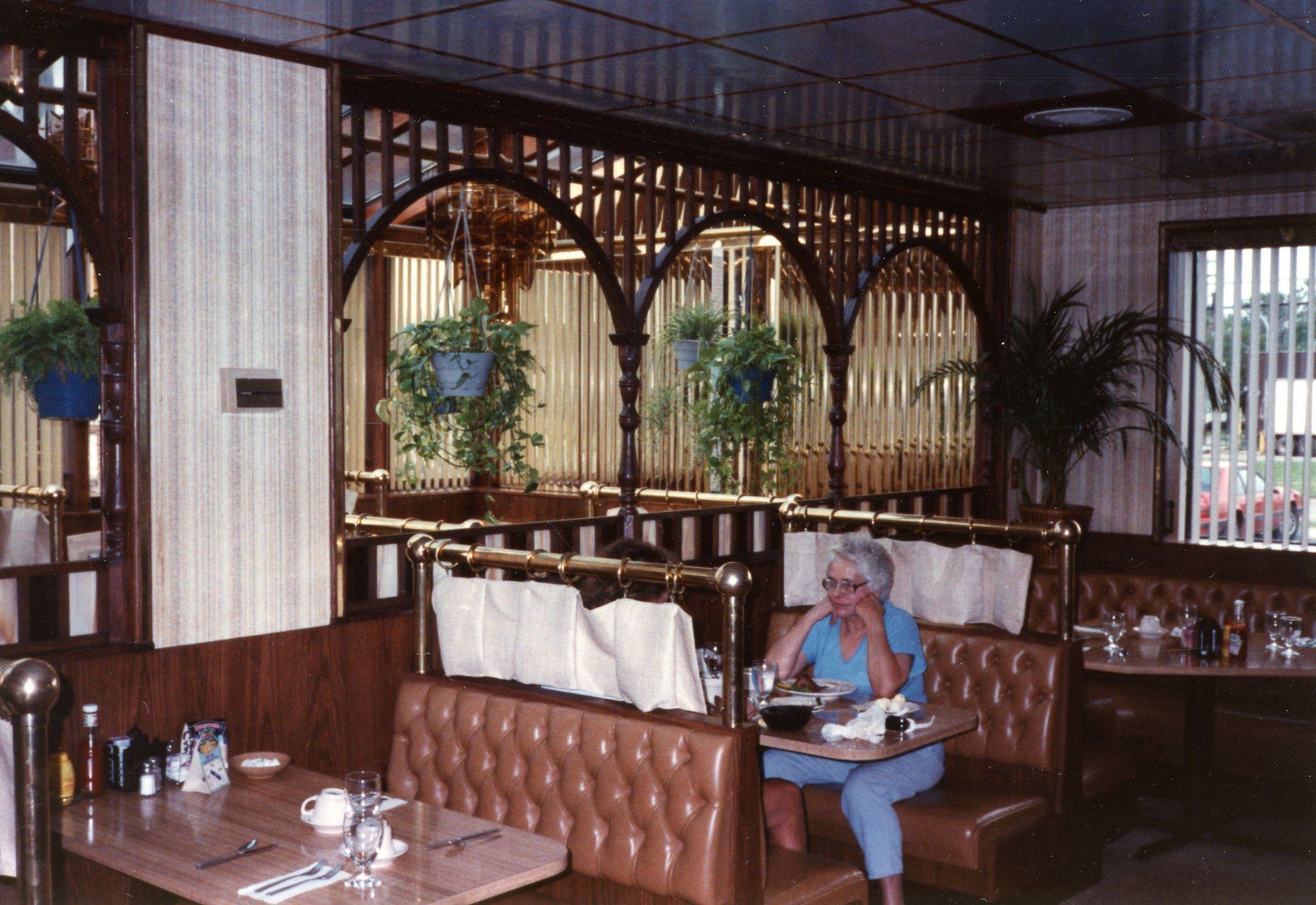 Rear entrance showing glass-roofed sunroom. Gold vertical venetian blinds, gold chandeliers.