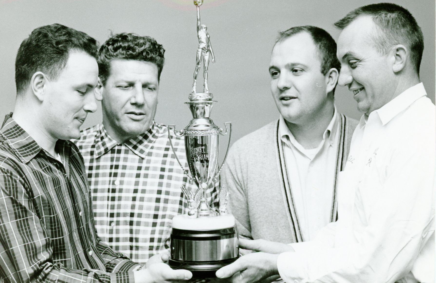 Police Officers Charlie White, Ted Di Pulas, Angelo De Mario and Ray LeCornu holding up a trophy. Photo was taken by Lothar E. Konietzko for the "Eagle".Cataloged By