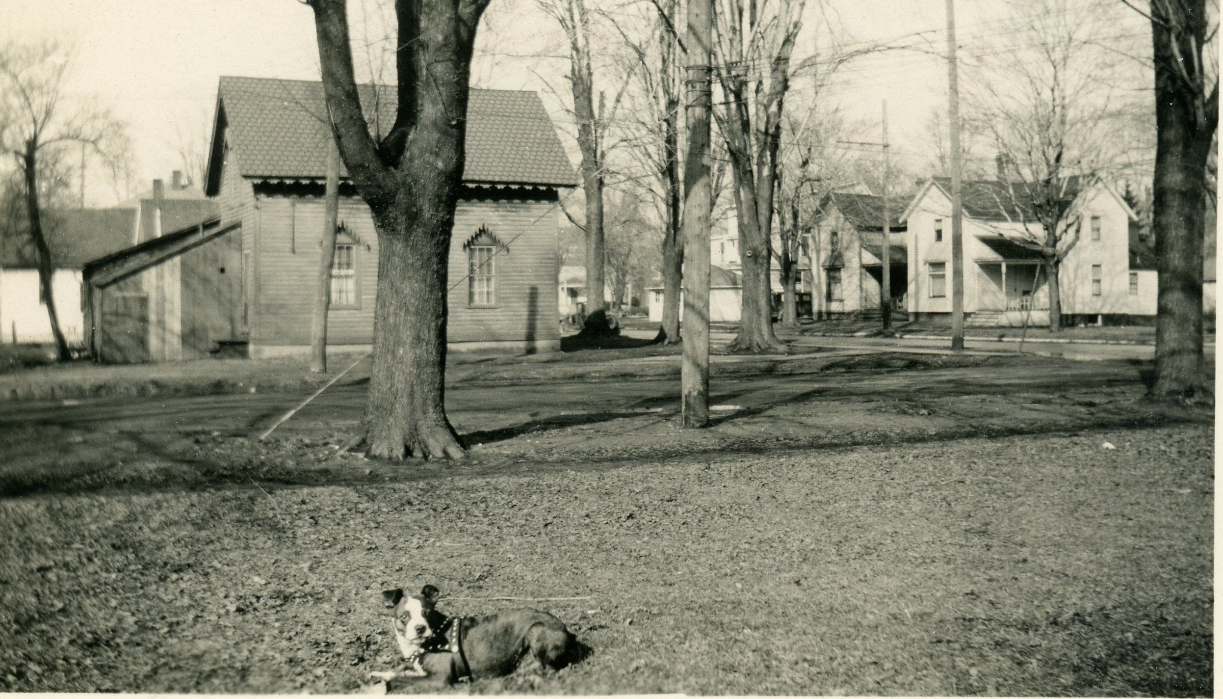 SW corner of Norris and Washington looking West. 35122 and 35116 Norris in background to the right. Dibs dog "Boots" in their yard.Cataloged By