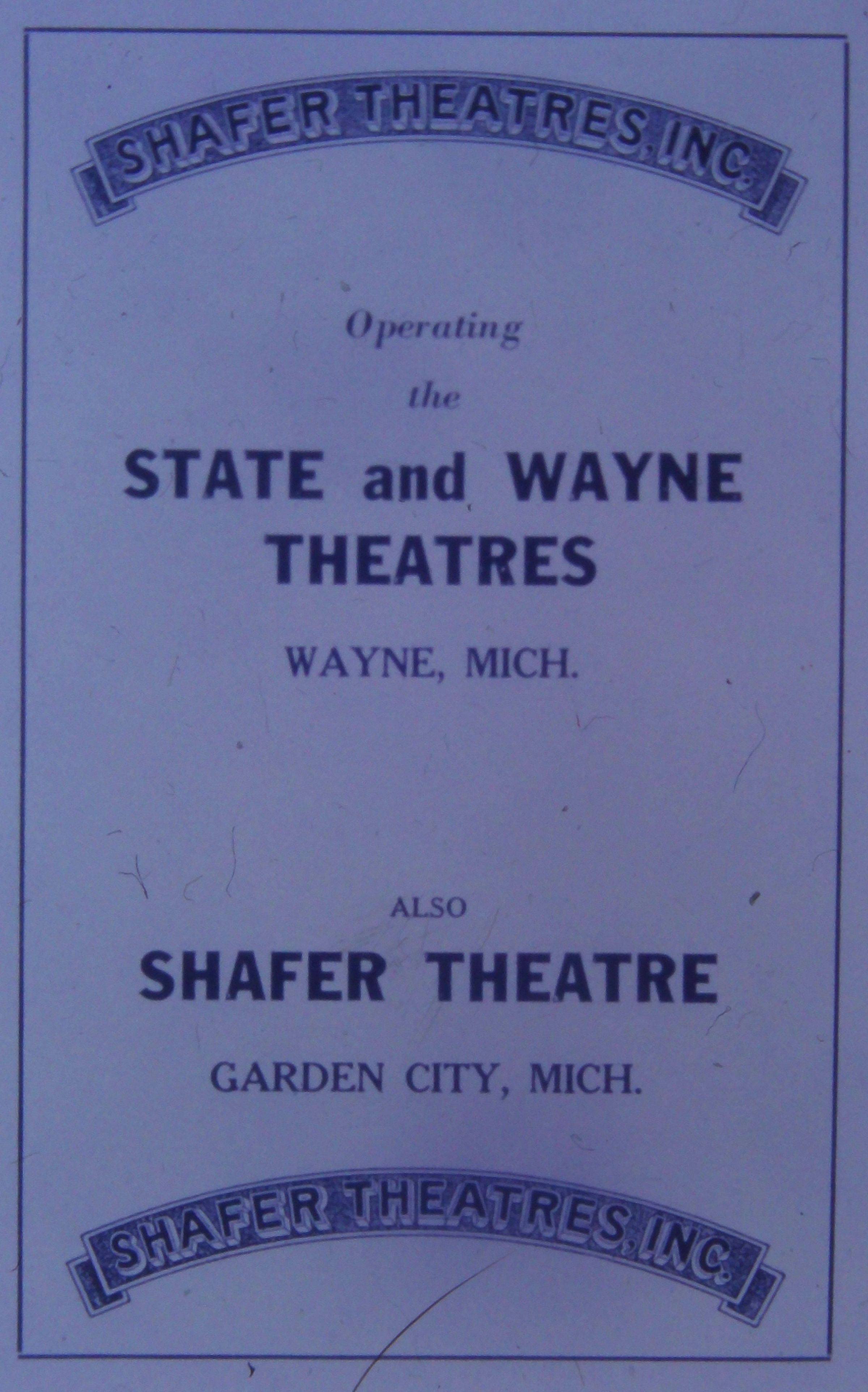 Shafer Theaters Inc. Ad - 1947. State and Wayne Theaters, and Shafer Garden City theater