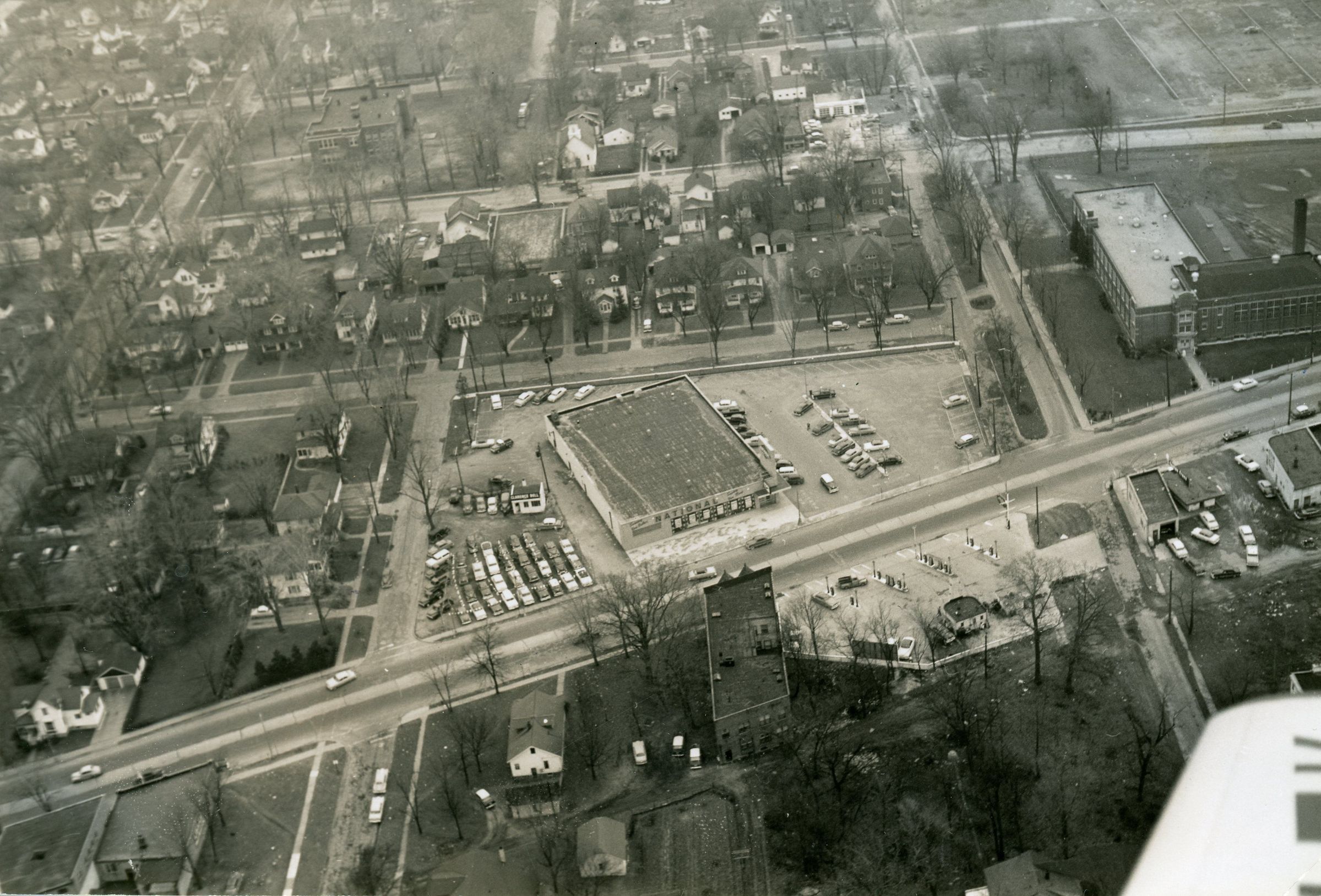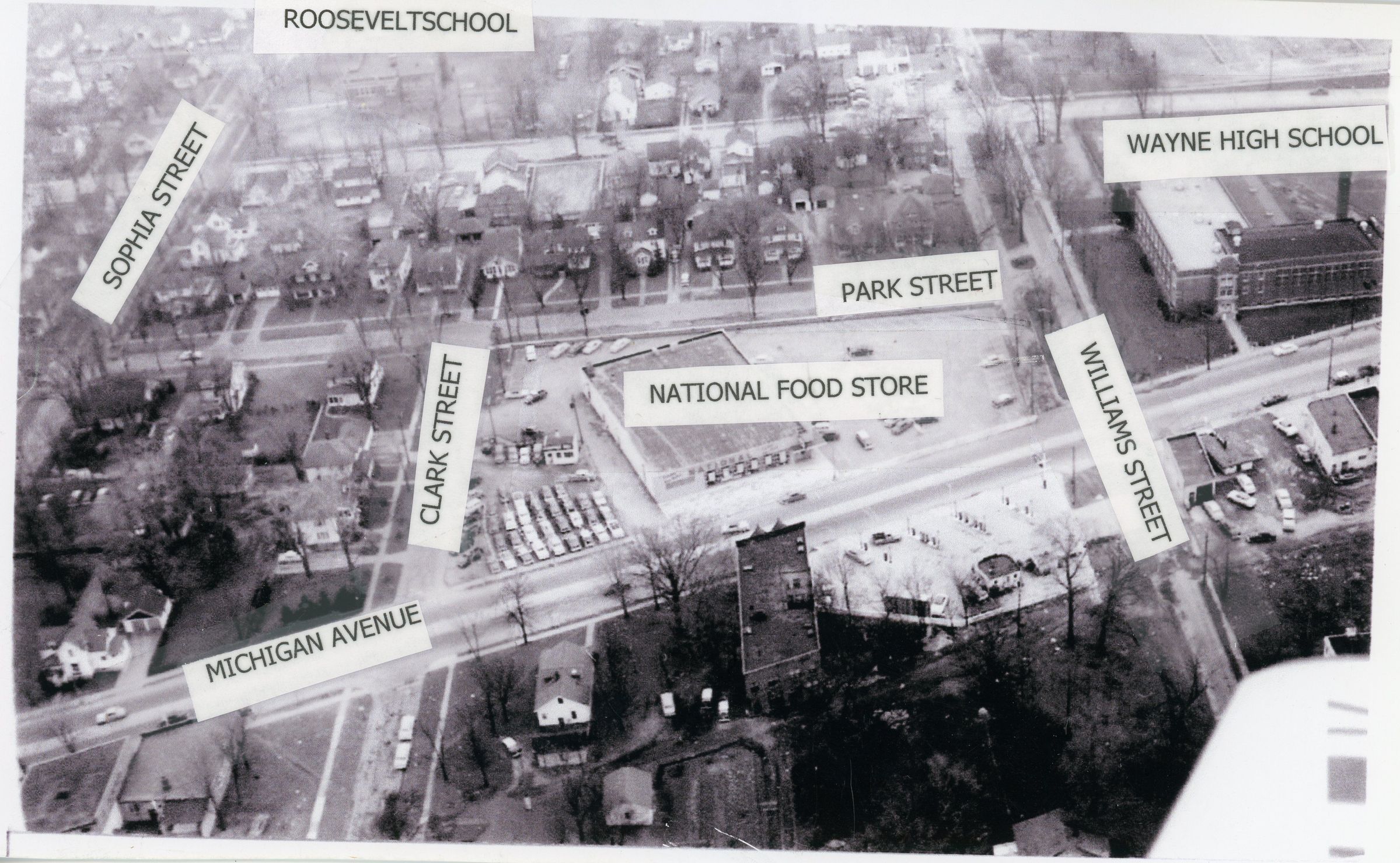Over Michigan Avenue between clark and Williams, looking South. National food store center, Old Wayne high school top right.Cataloged By
