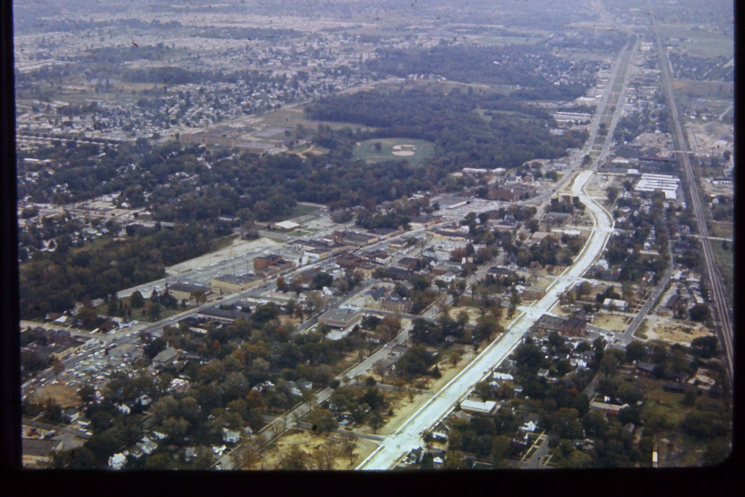 Aerial over Michigan Ave. EB. During Urban Renewal, early 60s, before Wayne road curve was built.