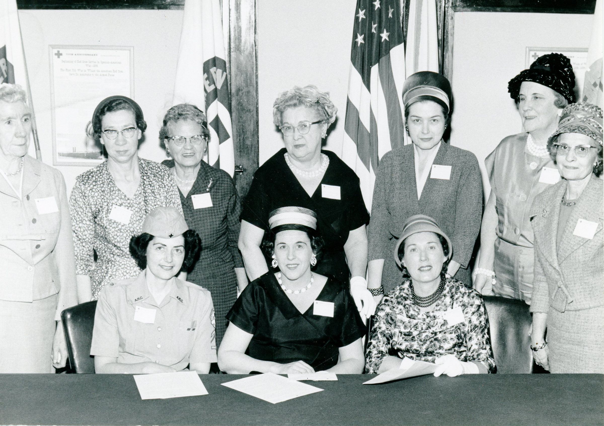 Red Cross 1961. Back Row: Mrs. James Ferguson, Myrtle Navatny, Hattie Humnick, Tracie Biggerstaff, Mildred Hanchett, Mrs. M.J. Scarlett, Mrs. Harold Maas. Front row are Detroit chapter people.Cataloged By