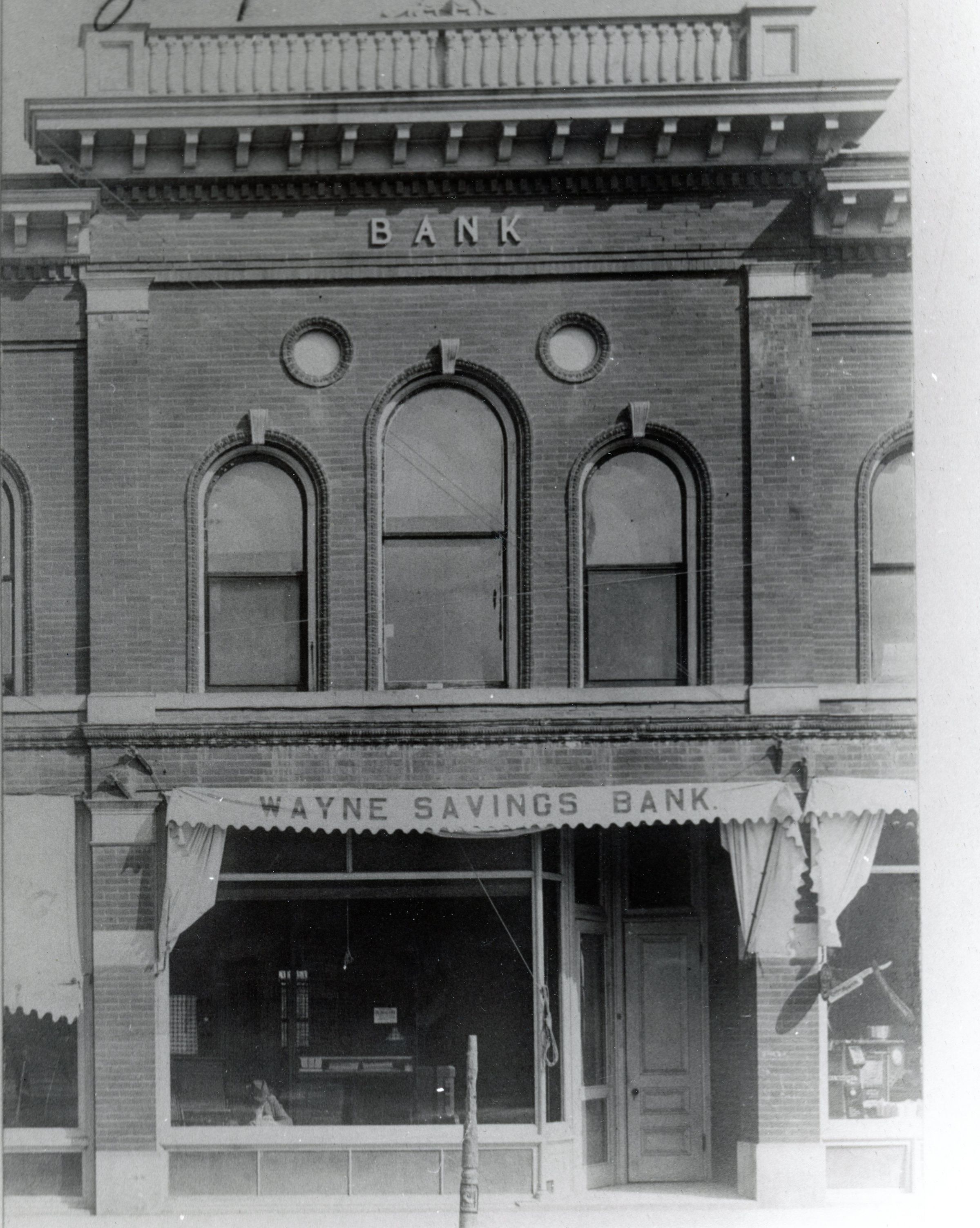 Wayne savings bank July 16, 1914. Michigan Avenue. After the bank closed in 1931, it became state bank and the national bank of detroit. This facade was rebuilt in the 1920s with a new art deco design and combined with building to left. Old address 34, 112.Cataloged By