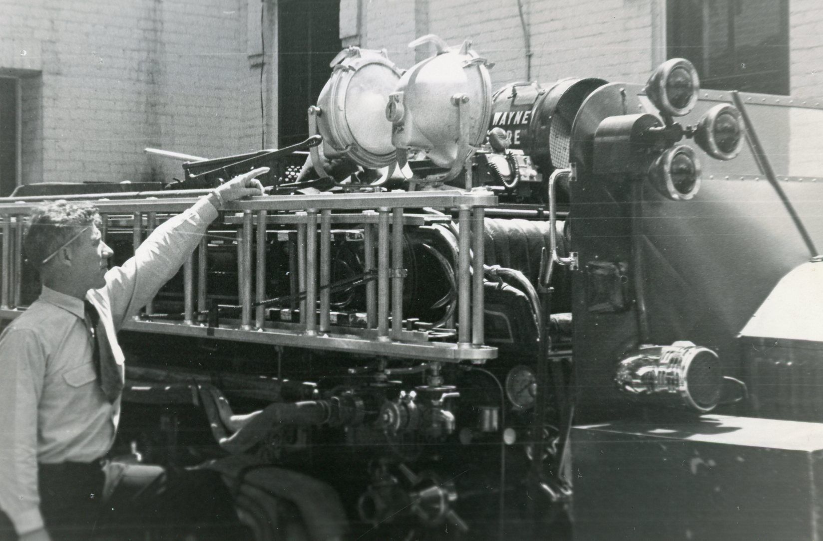 Hank Goudy points to two 500 watt flood lights on Old Betsy