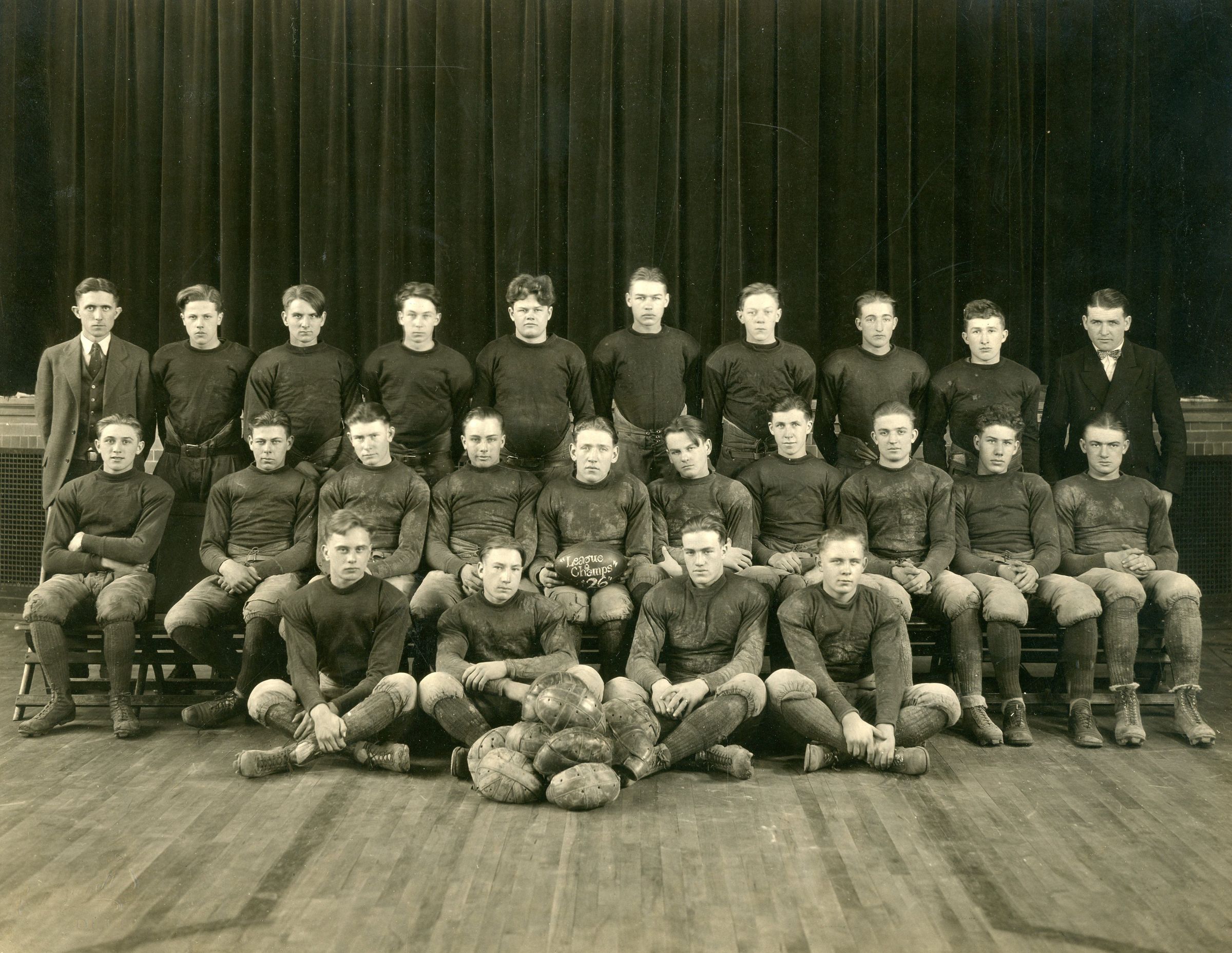 Wayne High School Football Team 1926. League Champions, Played Northville at Ypsilanti, won 18-0. Back Row: Coach C. R. Fuller, Ben Laitney, Ray Fair, Myron Hager, Paul Peters, Ed Yester, Richard Janner, Doug Wells, Frank Huffley, Assistant Coach Don Howell. Middle Row: Bernie Tykowski, Bill Johnson, Hector Ross, Roland Smith, Floyd Johnson, Arthur Glover, Weldon Emerson, Jim Koska, Hank Goudy, John Vallance. Front Row: Leonard Moicke, Norbert Schroeder, Russ Smith, Cliff Tyler.Cataloged By