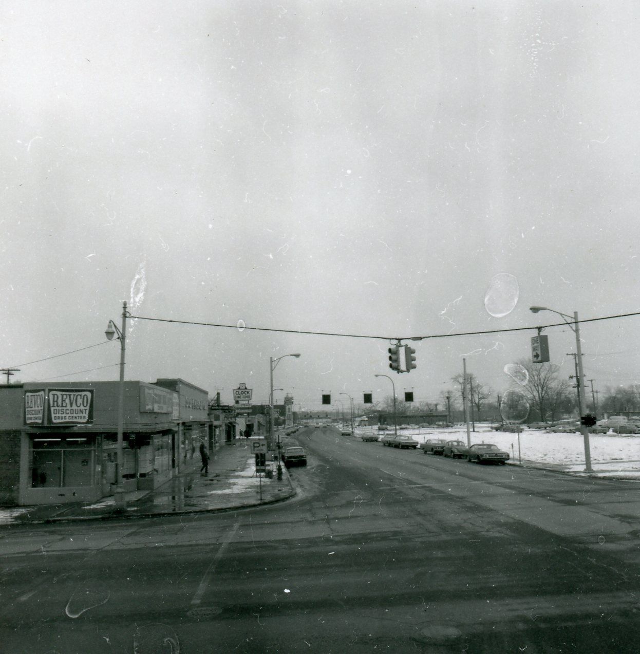 Michigan At Wayne road looking E. North side buildings survived, south side cleared. Feb. 1972, just after Urban Renewal.Cataloged By