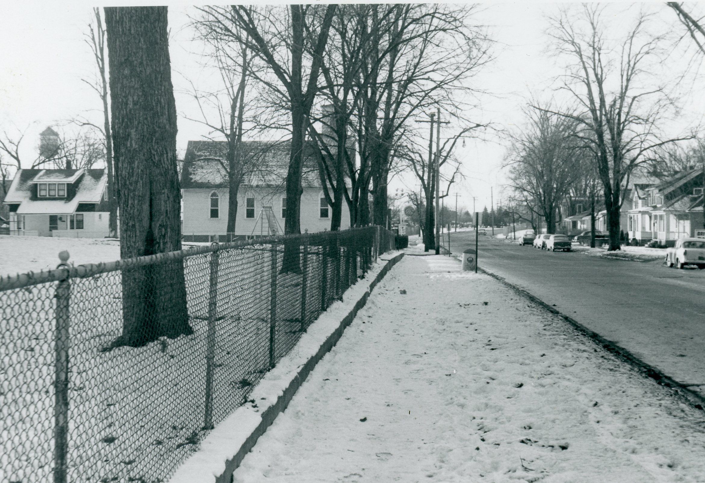 Main looking West from Sophia. Roosevelt school grounds on left, Free Methodist Church in distance at corner with Clark.