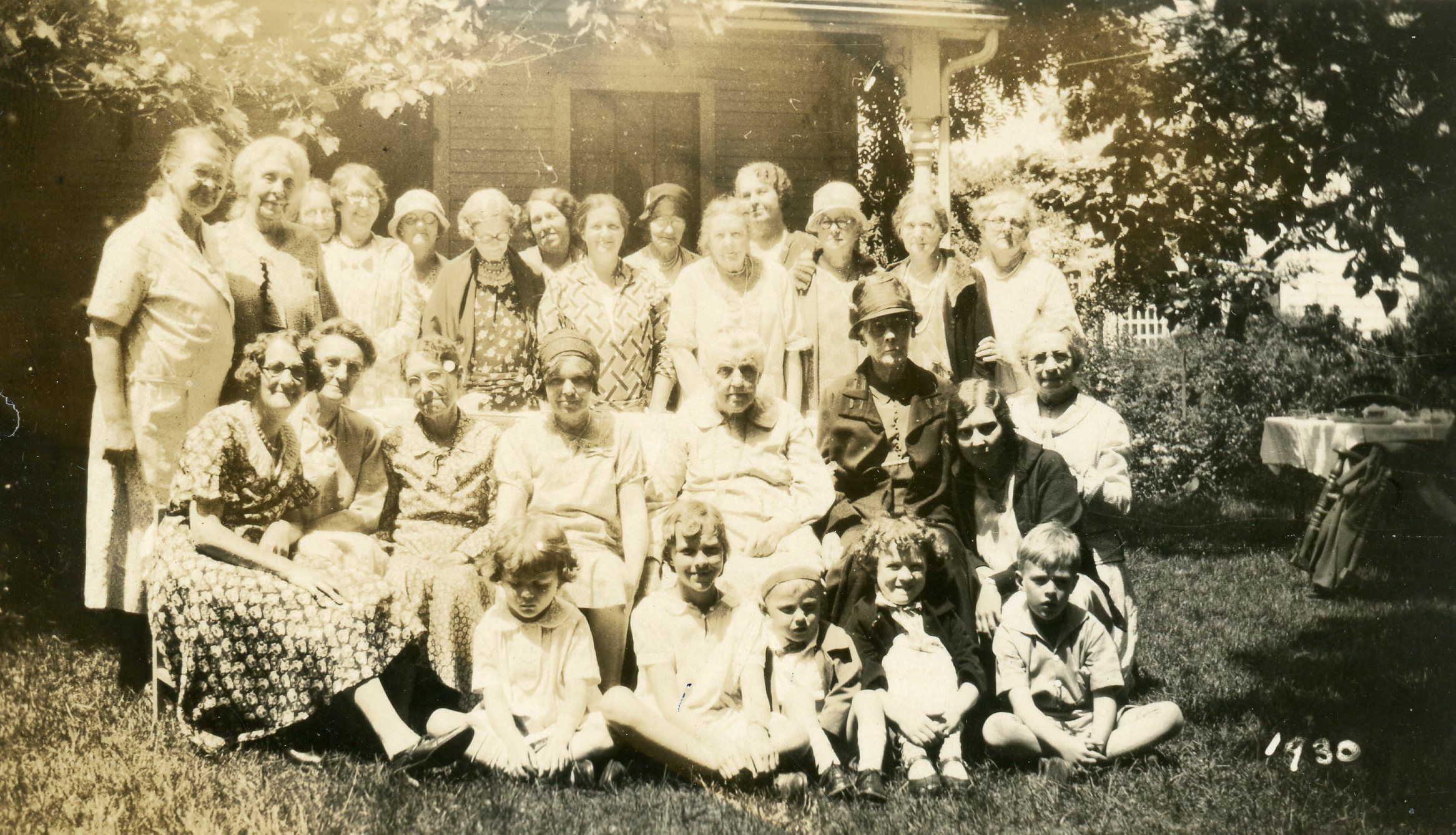 1930 Ladies Aid Society. Front Row; Anna Butler, Alice Nain, ?, May Foster, Nettie Cady, Mrs. Cardy, Anne English, Laura Butler, ?,?,?,?, and Robi Bills. Second Row; Mammie Smalley, ?, Myrtle Tinkham, Mrs. Norwood,?, Mrs Handyside, Dora Langworthy, Fanny Raymo. Back Row; ?,?,?,?, Grace Fransisco and Mary Forshaw. This photo was taken at Mammie Smalley's Home.Cataloged By