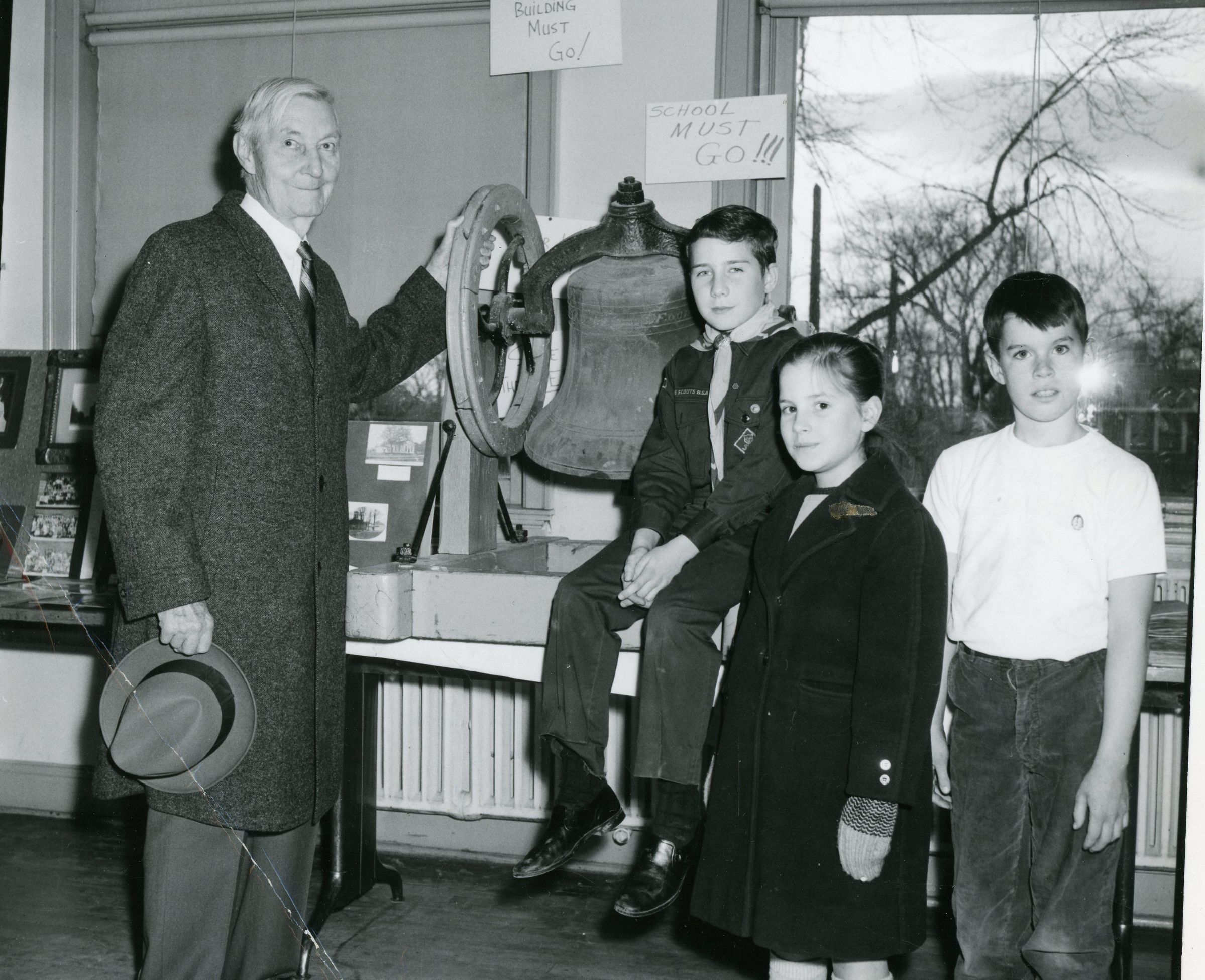 Roosevelt School Bell. (L-R) John Muller (Wayne Class of 1893), Russell Spicer, Holly Downs, Larry Timmer.